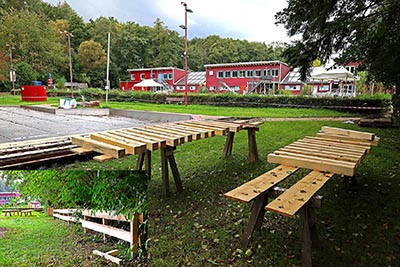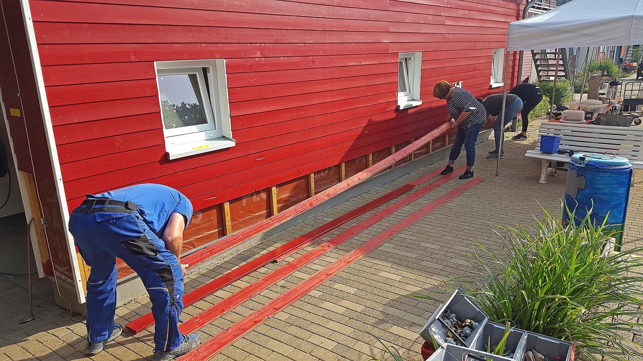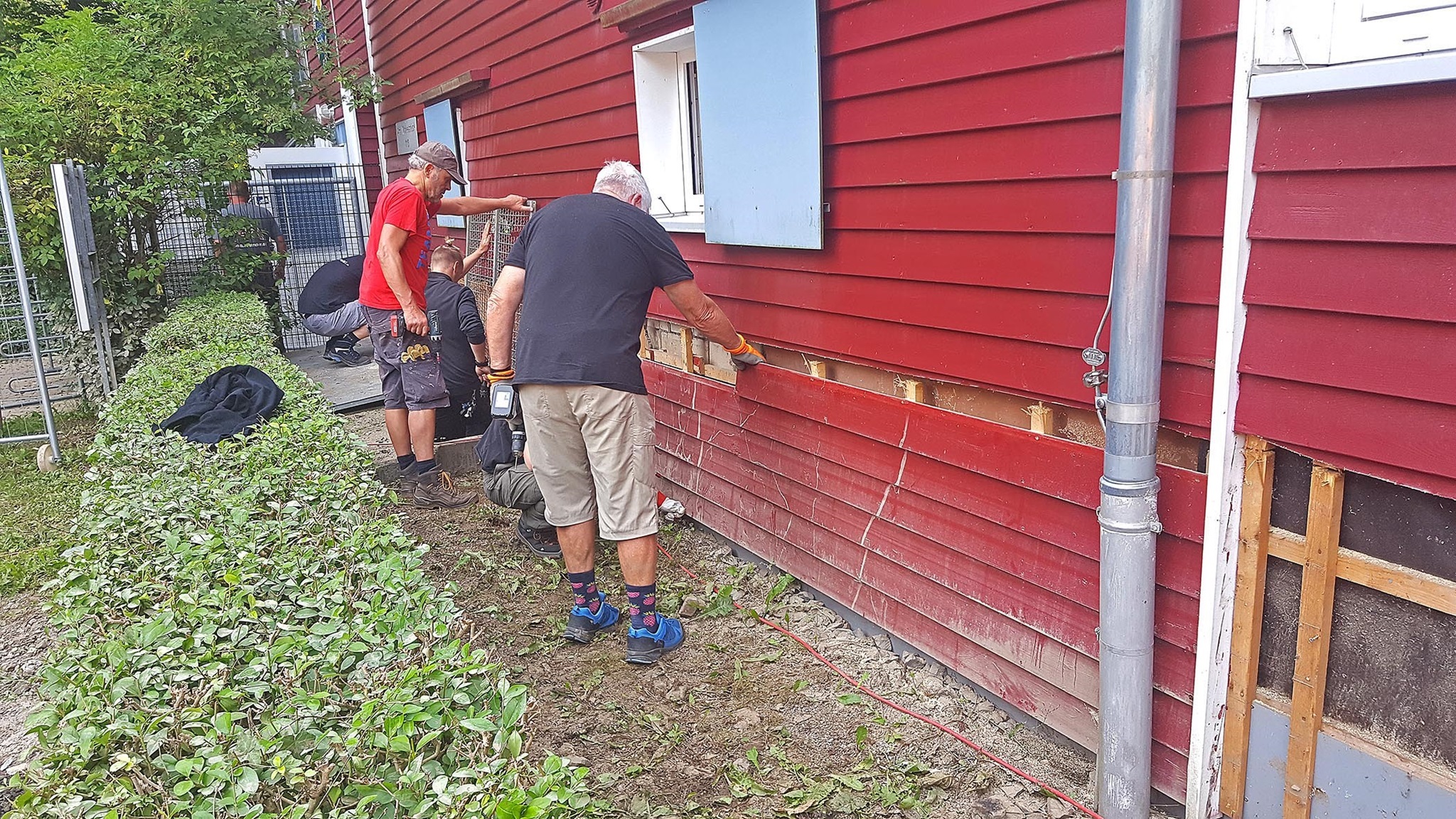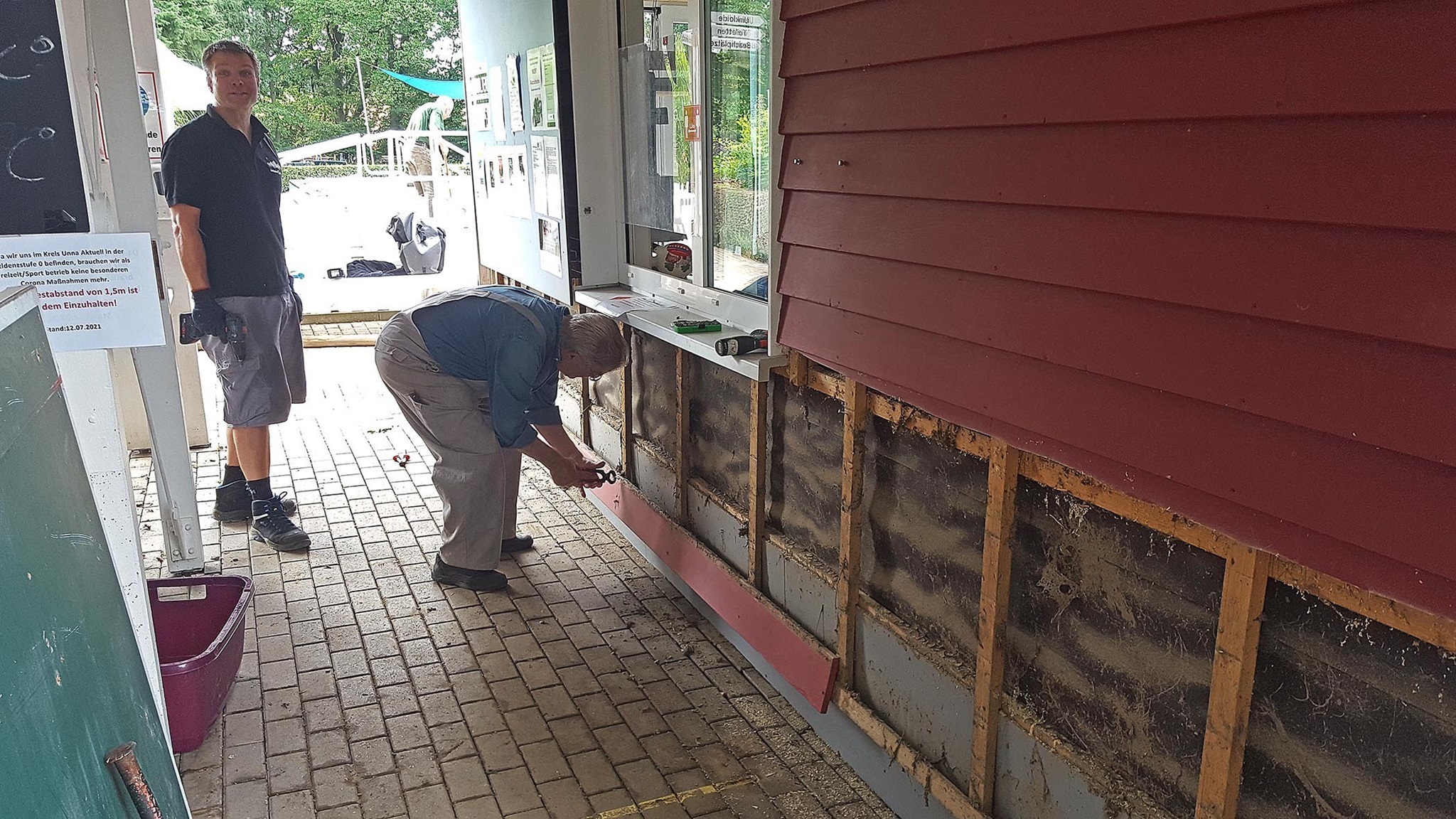 24. Juli: Zwei große Aktionen mit insgesamt ca. 30 ehrenamtlichen Helfern laufen heute: Ab 8 Uhr schrauben wir rund um das rote Badgebäude die Fassadenbretter bis in ca. 1,2 m Höhe ab und legen so den nass gewordenen Unterbau frei; vor allem die vollgesogene Dämmwolle muss aus der Wand heraus, damit das Holz trocknen kann und keinen dauerhaften Schaden nimmt. Auch einige Innenwände müssen geöffnet werden; besonders schlimm ist das bei den KollegInnen der DLRG, die ihre Sanitäranlagen gerade mit großem persönlichen Einsatz neu gebaut hatten: Noch kein Mal genutzt, und schon muss alles wieder raus! Dank der vielen Nothelfer ist dieser erste Schritt zur Trocknung des Gebäudes am Abend erledigt - super, liebes Team!