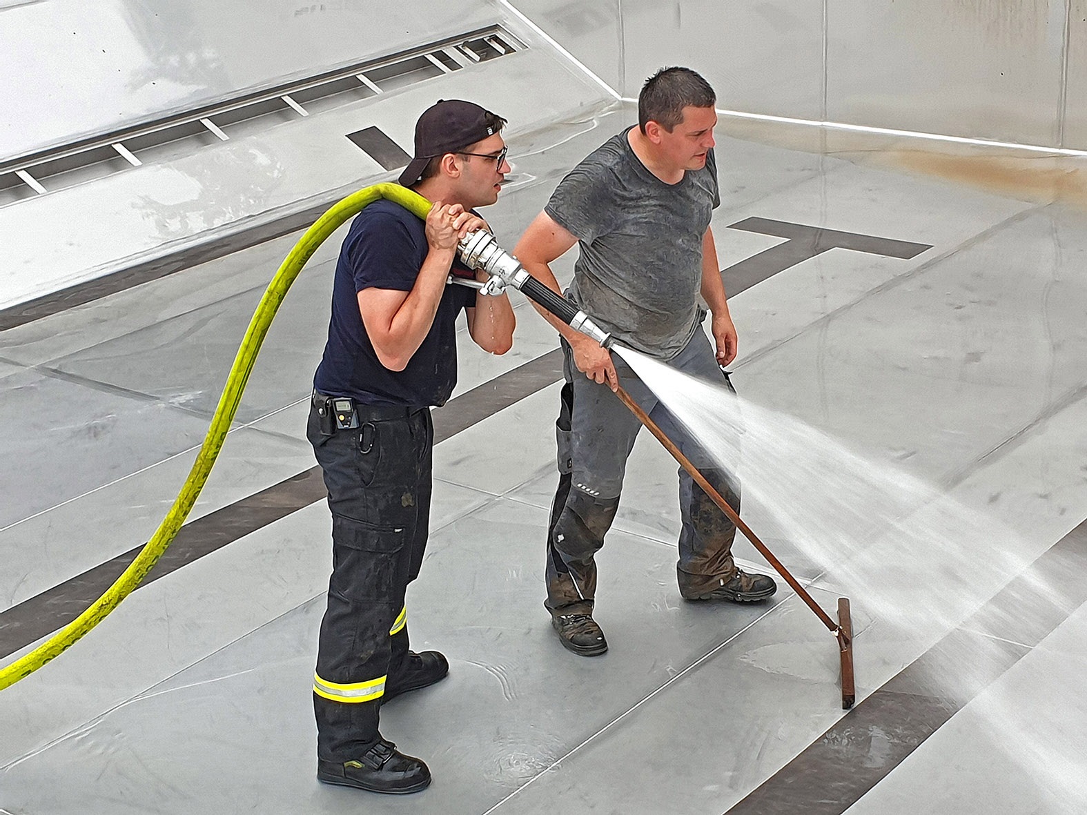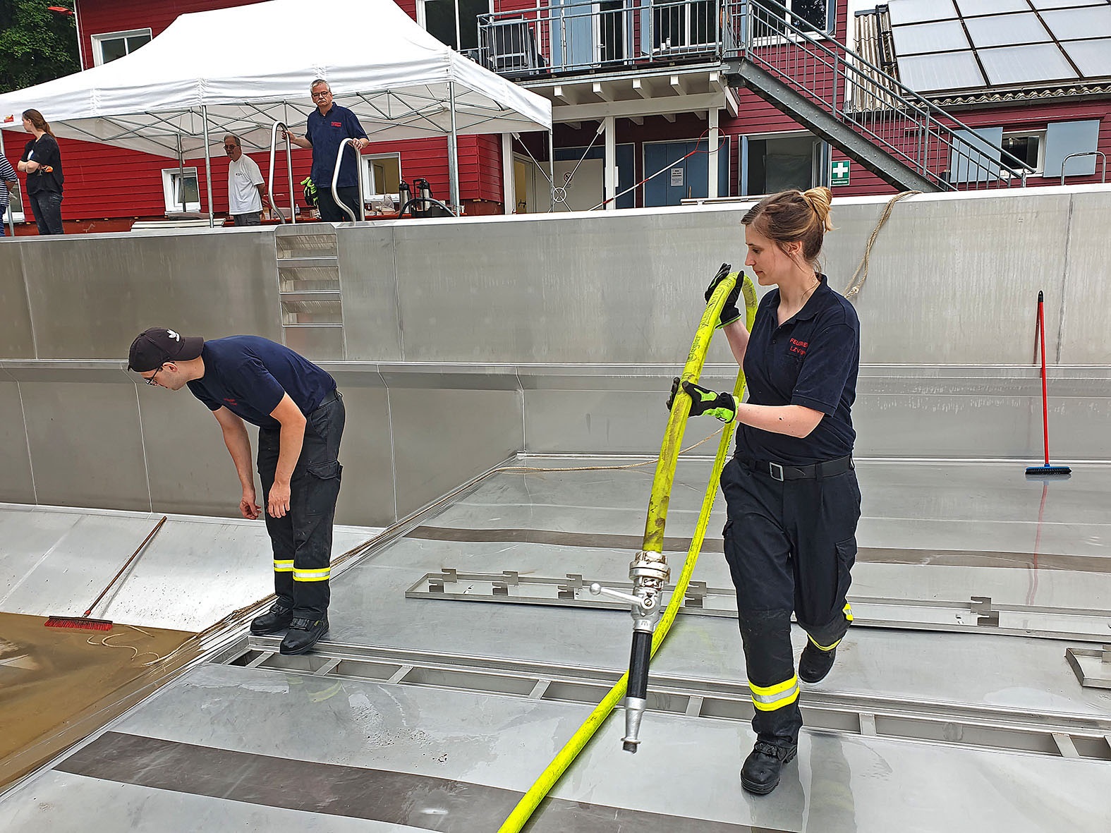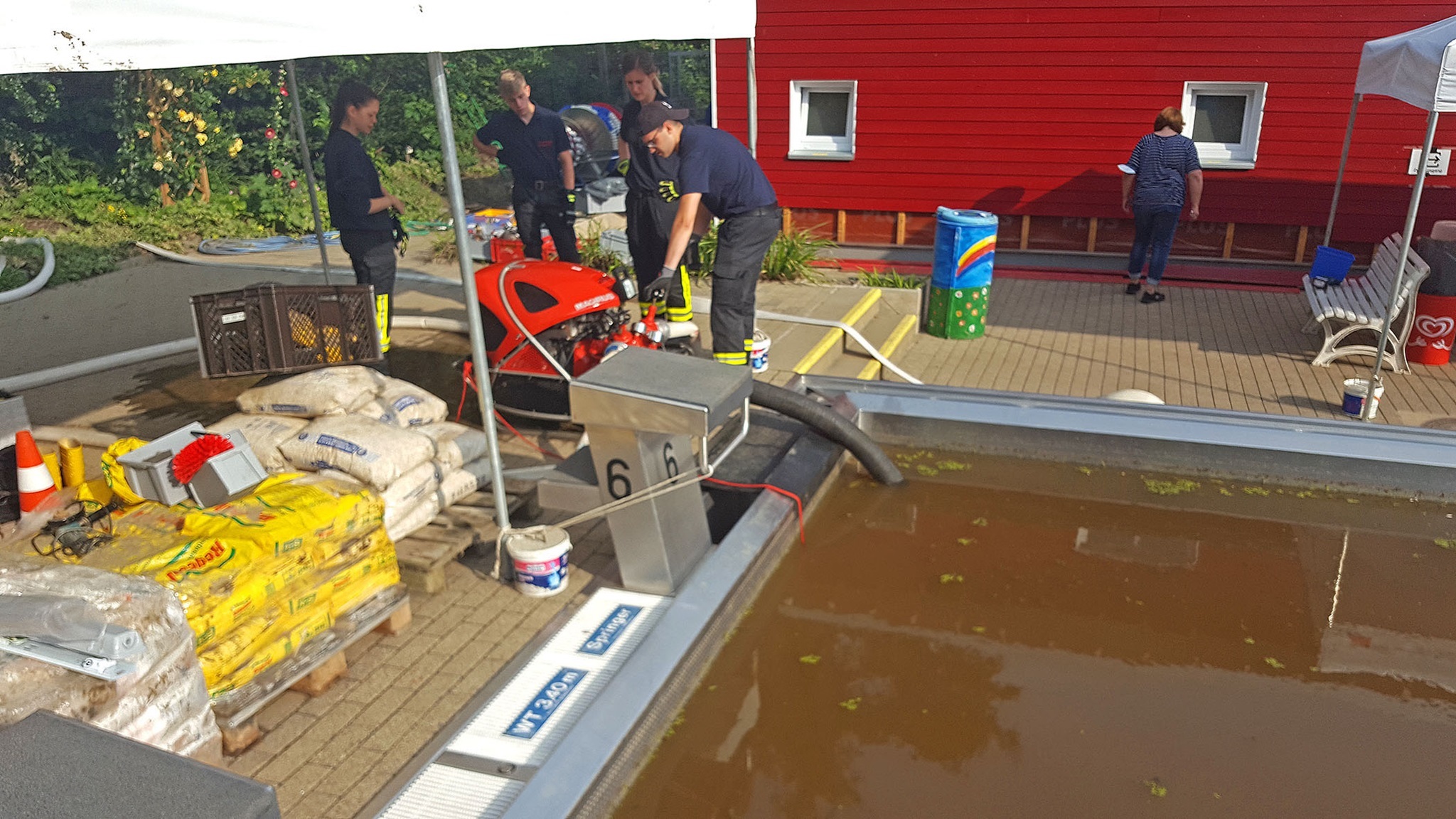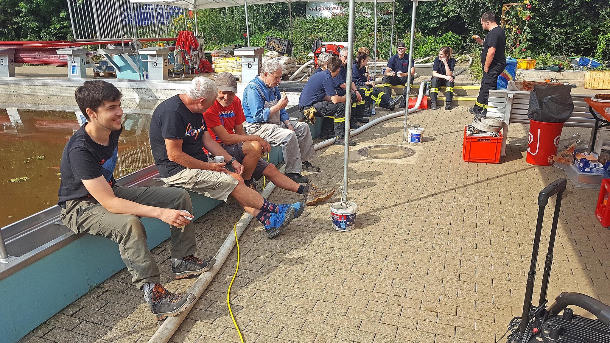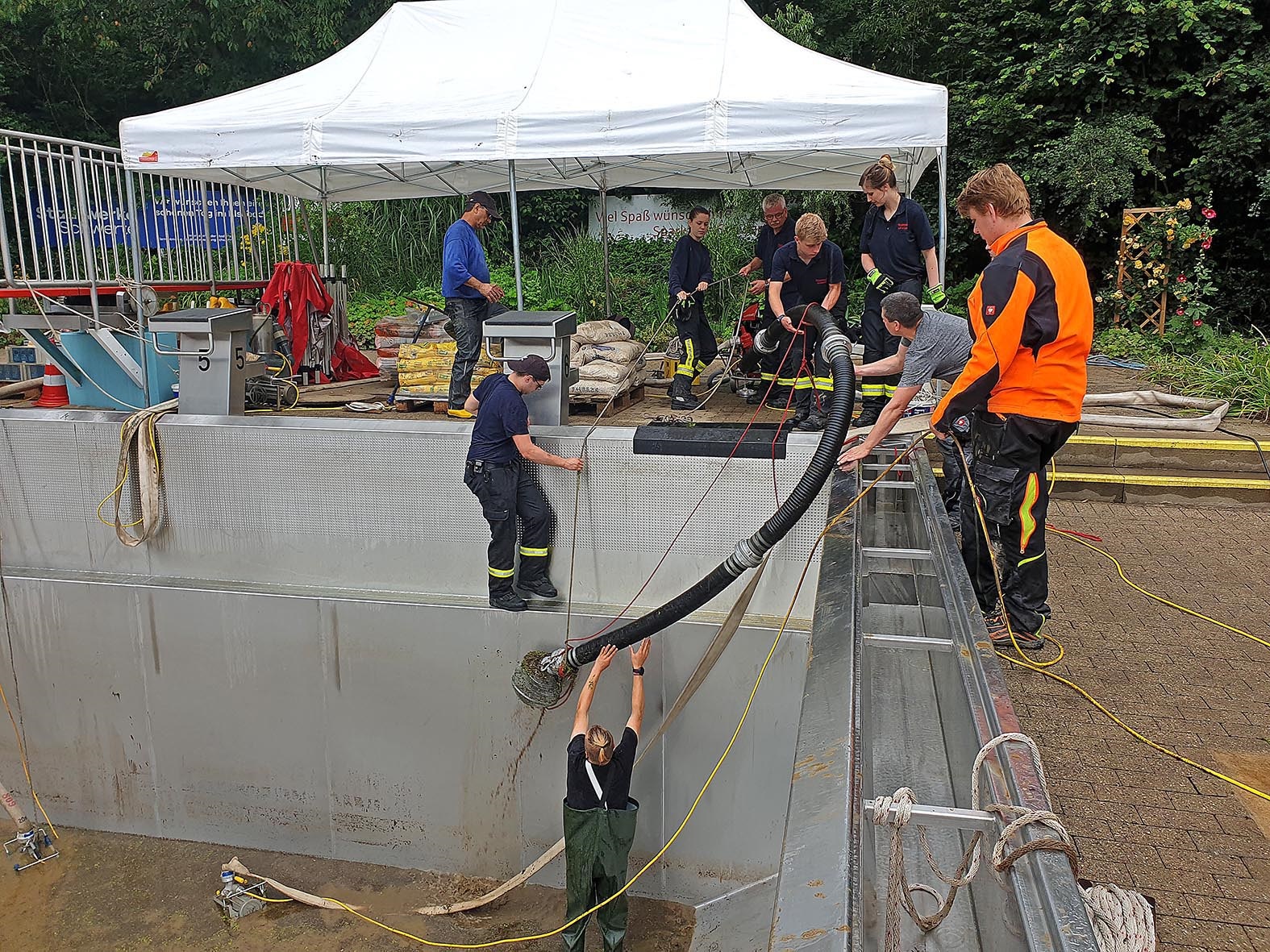 Um 9 Uhr rückt die Feuerwehr Villigst an (kurzfristig eingesprungen für das THW, die zu einem Katastropheneinsatz gerufen wurden): Mit einer leistungsstarken Pumpe saugen sie das Dreckwasser aus dem Becken und helfen uns auch beim Reinigen der Edelstahlplatten; gegen 17 Uhr ist diese Arbeit erledigt - ganz großen Dank an die tollen Feuerwehrleute!