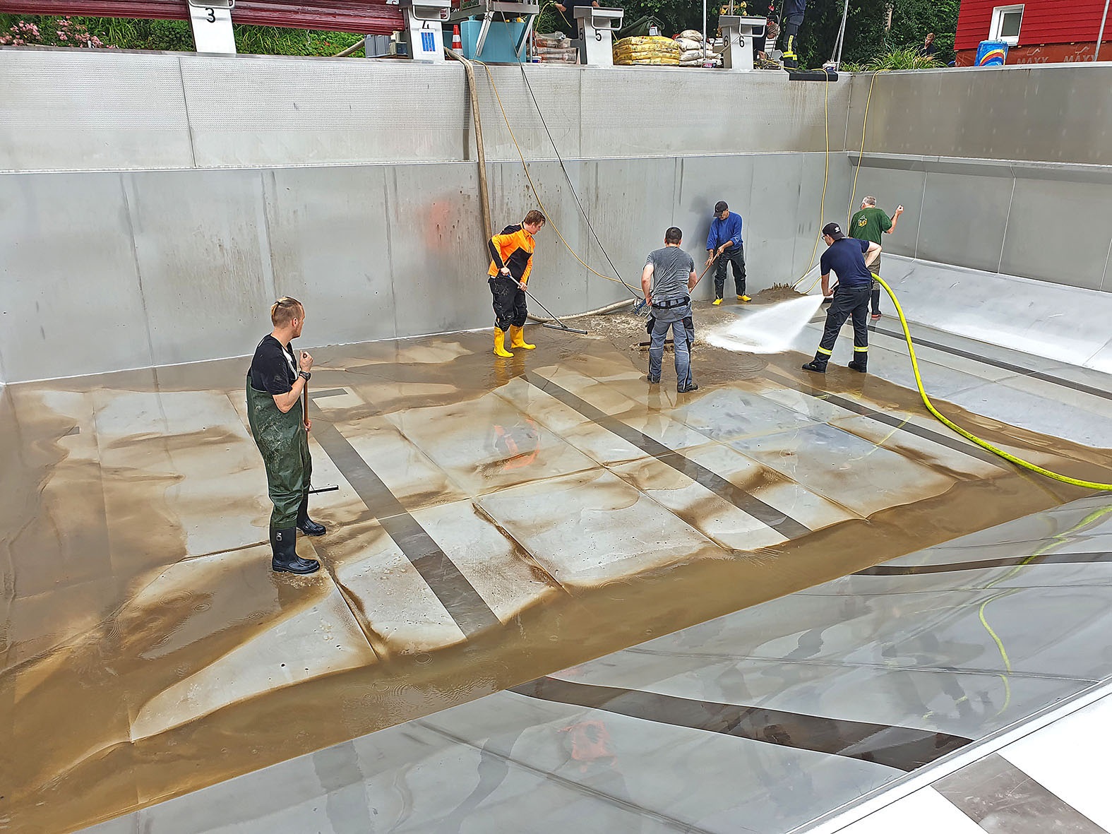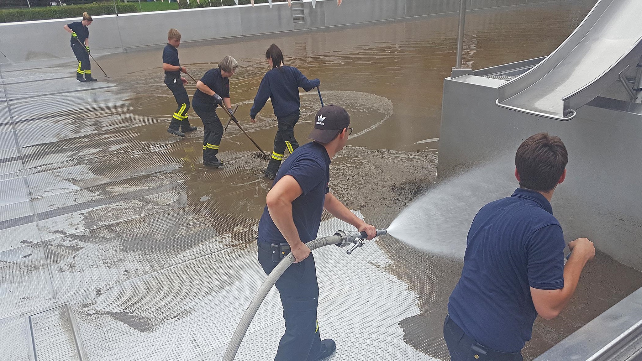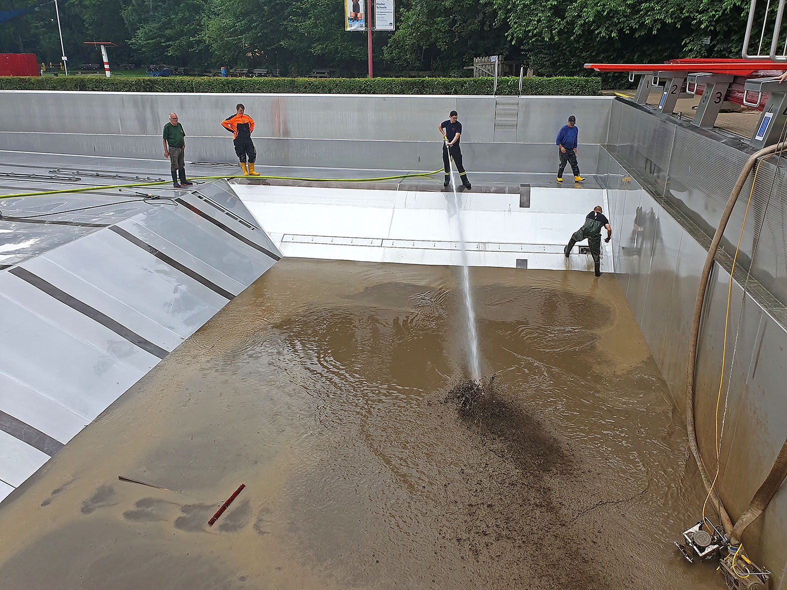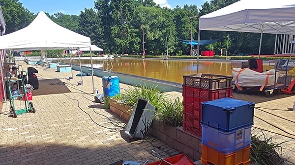 16. Juli: Viele Aufräumarbeiten sind schon gemacht: Die Feuerwehr hat, nachdem der Elsebach in sein Bett zurückgekehrt ist, alle Kellerräume leer gepumpt - herzlichen Dank für die Hilfe. 40 Helfer sind am Donnerstag und Freitag spontan gekommen und haben die Beckenumgänge und die überfluteten Räume vom Schlamm befreit. Das Planschbecken glitzert sogar schon wieder silbern in der Sonne. Vorn am Parkplatz haben die Kollegen mit Schaufel und Schubkarre die dicke Schlammschicht beseitigt.