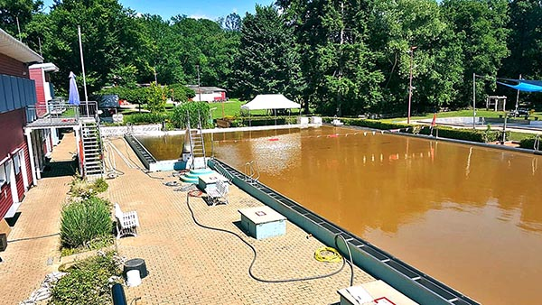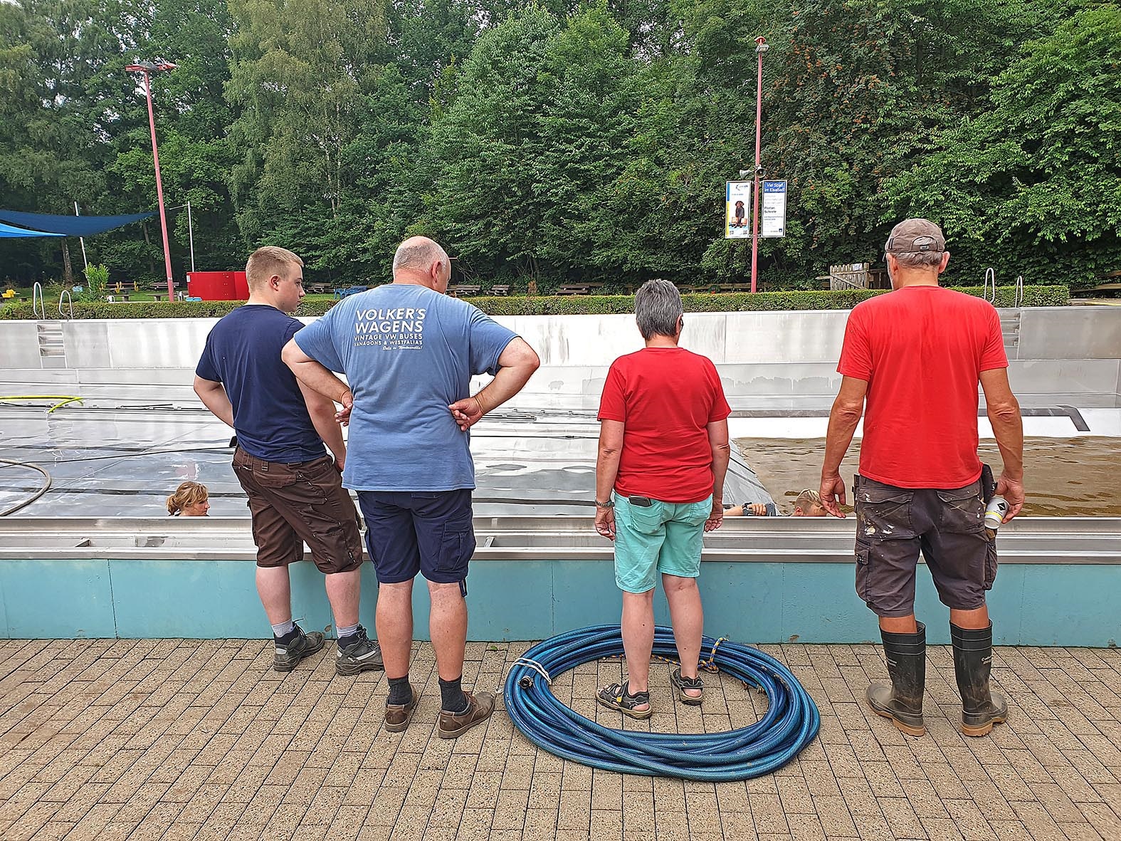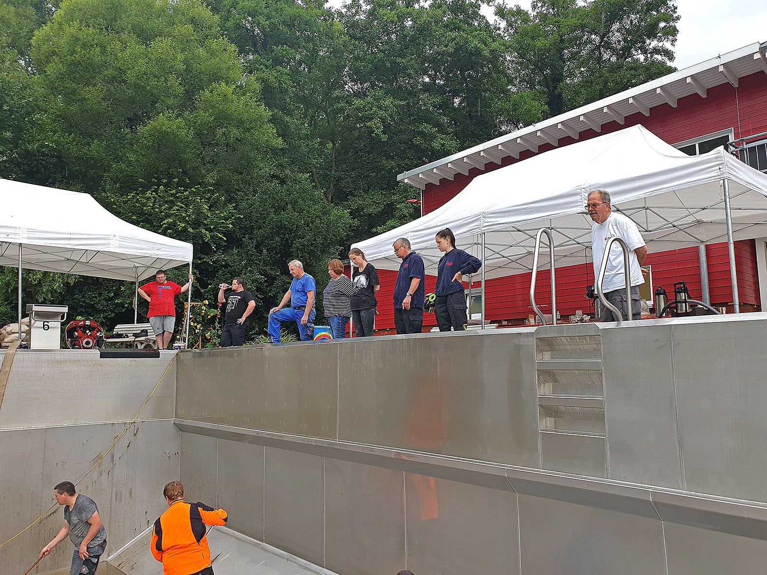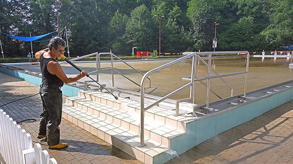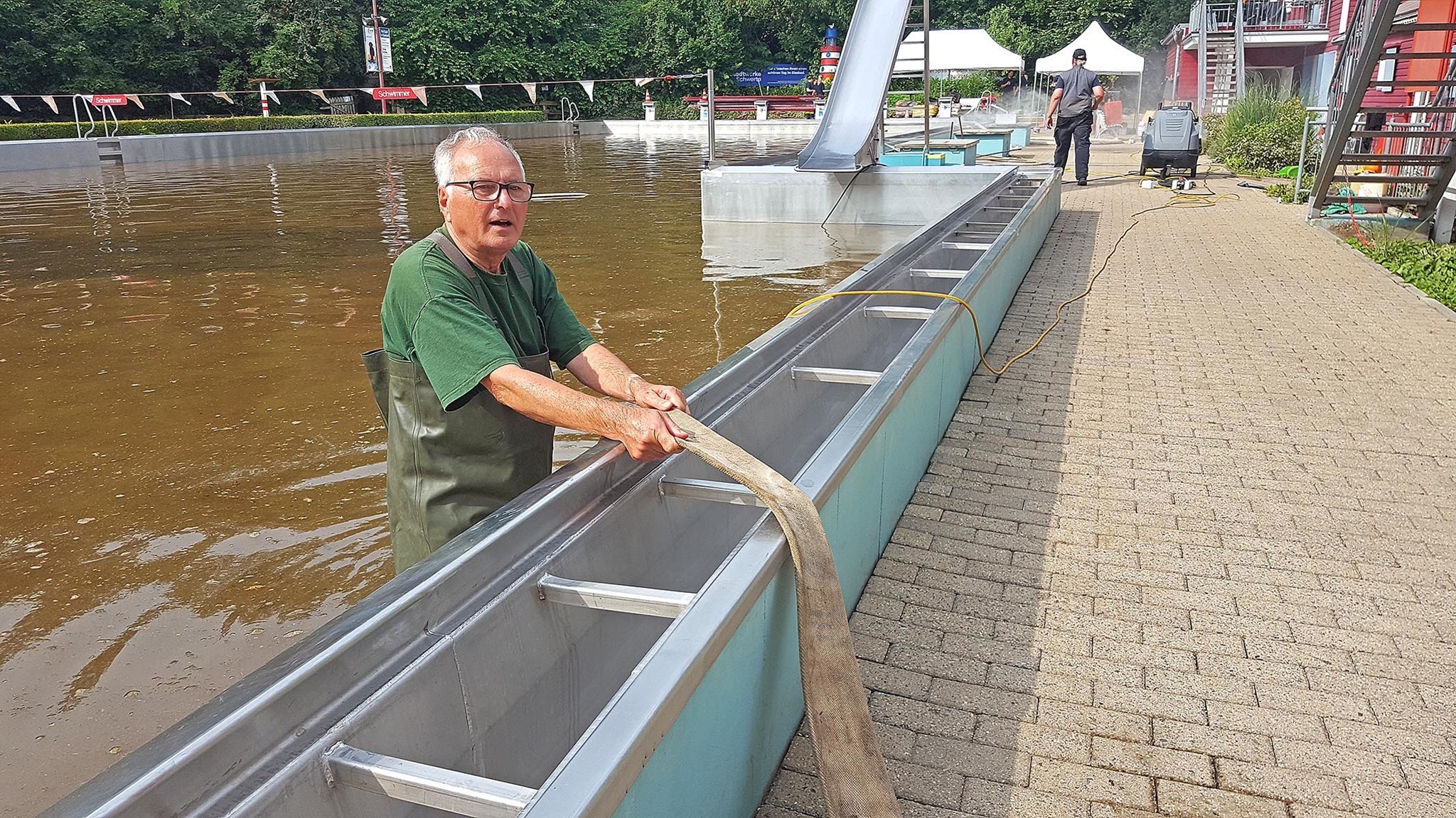 16. Juli: Viele Aufräumarbeiten sind schon gemacht: Die Feuerwehr hat, nachdem der Elsebach in sein Bett zurückgekehrt ist, alle Kellerräume leer gepumpt - herzlichen Dank für die Hilfe. 40 Helfer sind am Donnerstag und Freitag spontan gekommen und haben die Beckenumgänge und die überfluteten Räume vom Schlamm befreit. Das Planschbecken glitzert sogar schon wieder silbern in der Sonne. Vorn am Parkplatz haben die Kollegen mit Schaufel und Schubkarre die dicke Schlammschicht beseitigt.