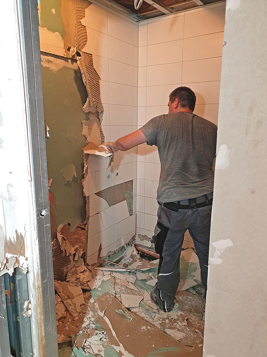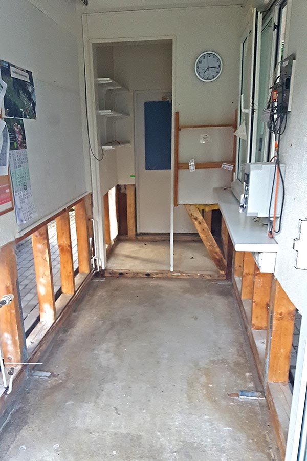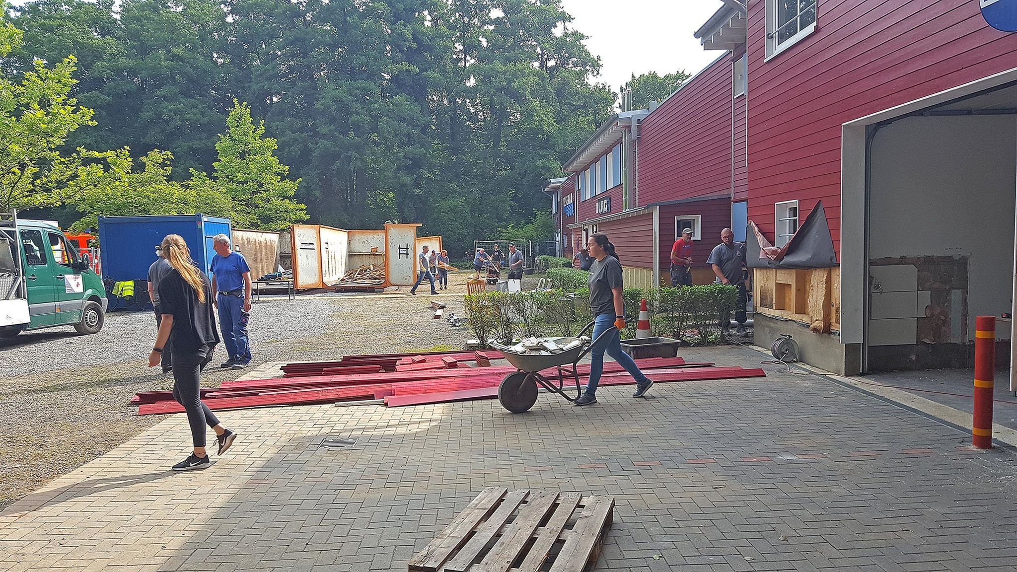 Am Nachmittag haben wir das ganze Gebäude leergeräumt und zudem einen Bürocontainer auf dem Parkplatz eingerichtet; denn morgen muss die Fassade des Gebäudes geöffnet werden, damit die nass gewordenen Wände getrocknet bzw. erneuert werden können.