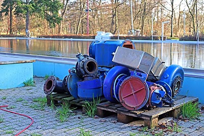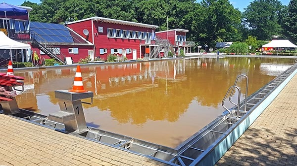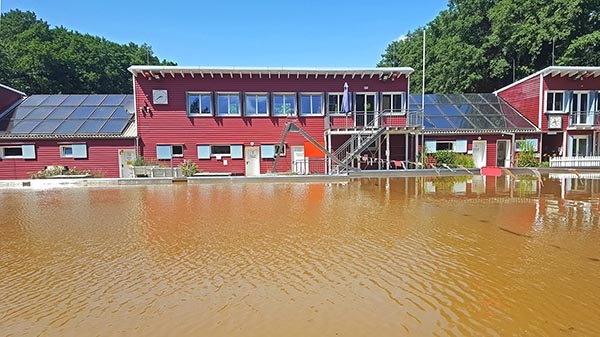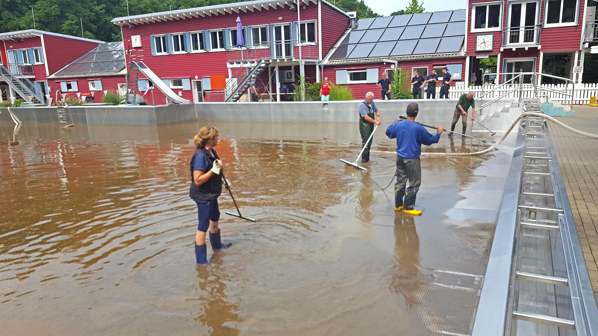 17. Juli: Unser Krisenstab hat eine erste Einschätzung des entstandenen Schadens versucht. Allerdings fehlen noch Antworten auf viele technische Fragen. Denn nachdem das Badgelände weitgehend aufgeräumt ist und 'nur noch' im großen Becken die braune Brühe steht, geht es 'ans Eingemachte': Wie ist der Zustand der vielen Pumpen, insbesondere großen Umwälzpumpen (die müssen ausgebaut und überprüft werden)? Wieviel der elektrischen Anlage ist zerstört und muss erneuert werden (nach dem letzten Hochwasser hatten wir die Elektroschränke wesentlich höher angebracht; trotzdem waren sie teilweise geflutet)? Wird die Heizanlage noch funktionieren, die mit Gas betriebene ebenso wie die Solaranlage? Und welche Schäden hat das Gebäude davongetragen, dessen Wände im Erdgeschoss mehr als knietief unter Wasser standen?