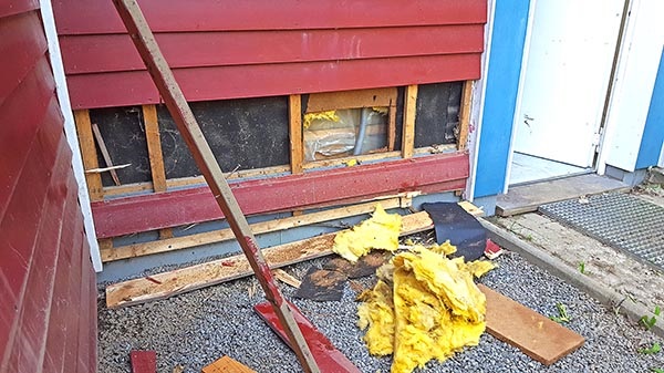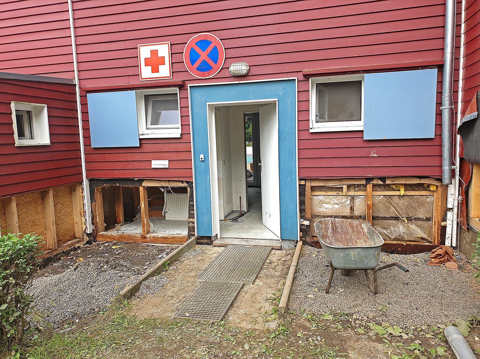 21. Juli: Der Parkplatz wird seit heute von der Schlammschicht befreit, am Abend sind schon zwei Einstellbuchten fertig samt neuer Schotterschicht - Dank an die SEG. Im Gelände haben ehrenamtliche Helfer den zerstörten Zaun bereits abgetragen. Auch die Reparaturarbeiten am großen Schaltschrank im Technikkeller haben begonnen, während die Steuerungseinheiten der Heizkessel weiter getrocknet werden. Ein erster Blick hinter die rote Fassade hat gezeigt, dass die dort eingebauten Spanplatten viel Feuchtigkeit aufgesogen haben, die dahinter liegende Dämmwolle ist tropfnass: Wir werden rundum am Gebäude die Fassade bis in die Höhe von ca. 1,5 m öffnen müssen - der Vertreter der Elementarschäden-Versicherung hat für den sofortigen Beginn der Arbeiten grünes Licht gegeben: Am Wochenende soll es losgehen. Am Abend berichtet die Lokalzeit im WDR-Fernsehen (ab Minute 5:00) ausführlich über die Lage im Elsebad. - Ansichten zum Tag bei Bilder und Berichte.
