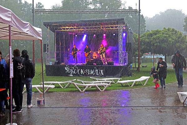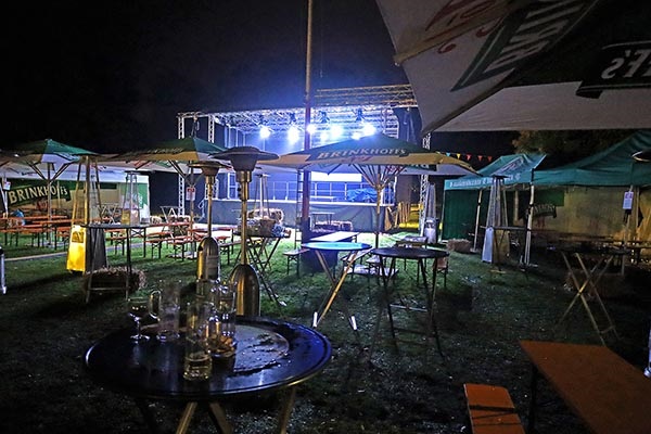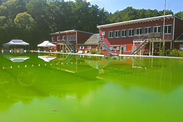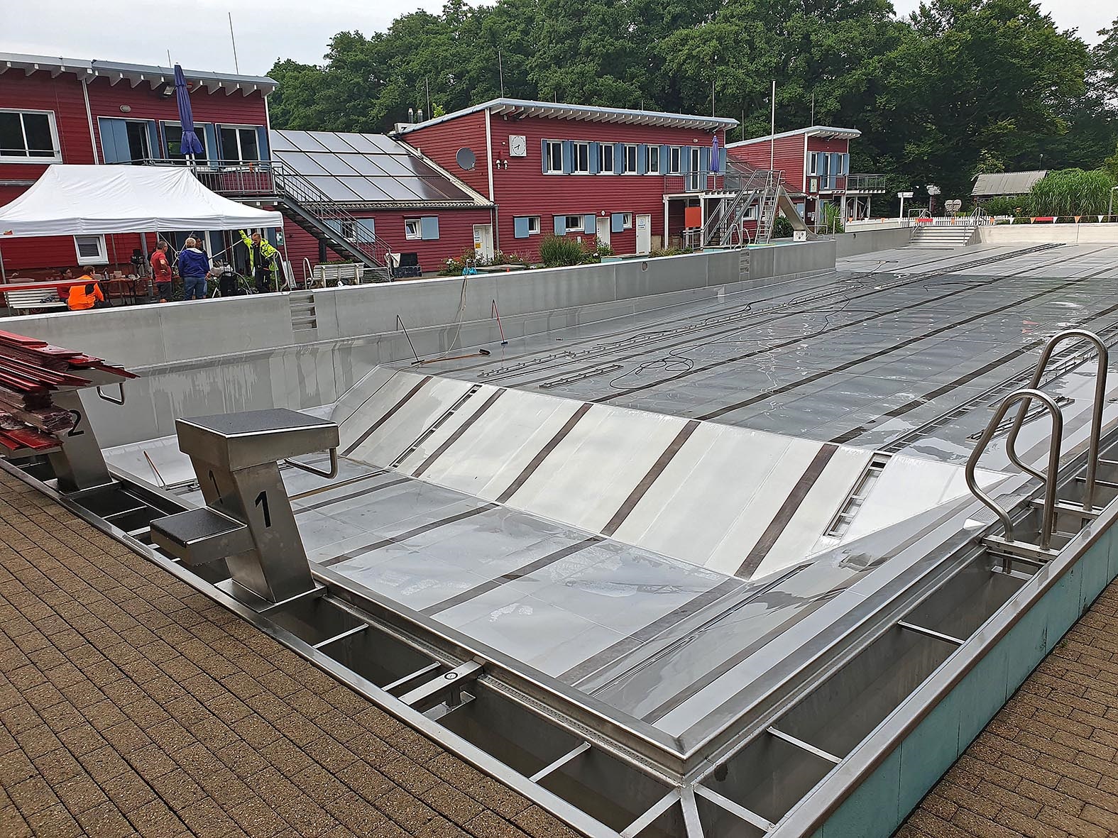 Veranstaltungen jenseits des Wassers können jetzt aber schon wieder stattfinden, denn einige Teile der elektrischen Infrastruktur sind schon repariert. Die Reparatur bzw. Neuinstallation der Pumpen (alle Pumpen sind kaputt) benötigt aber einfach einige Zeit; die Chlorierungsanlage muss gänzlich erneuert werden. Und das Gebäude muss noch eine Weile mit teilweise offenen Wänden trocknen, bevor der Boden- und Wandaufbau (Estrich und Oberboden / Rigips, Dämmung, weitere Isolierschichten, Verbretterung und Fassadenbretter) wieder angebracht werden können. Die 1,5 Mio. Liter frisch eingelassenes Wasser sind in der Sommerwärme in Rekordzeit so grün geworden, wie es im Elsebad noch nie zu sehen war.