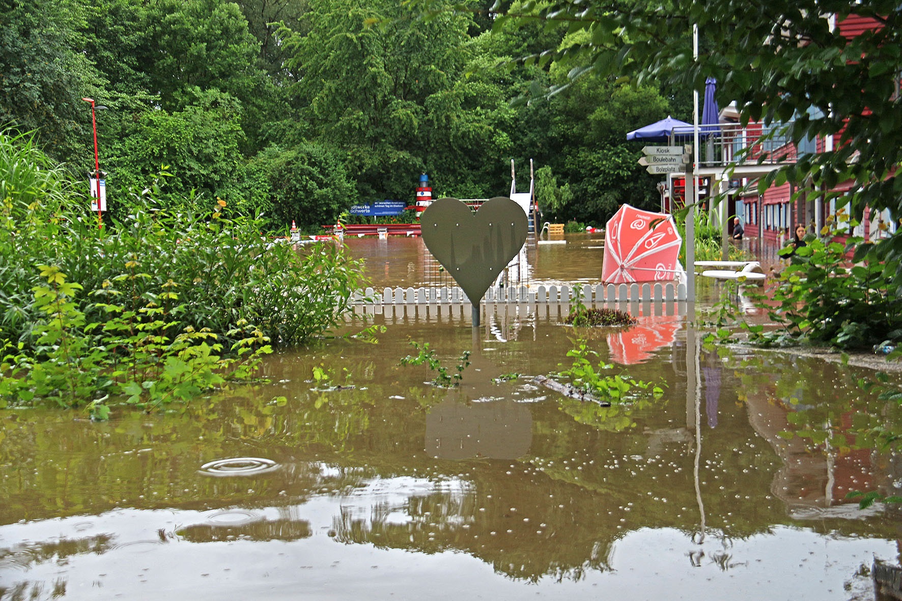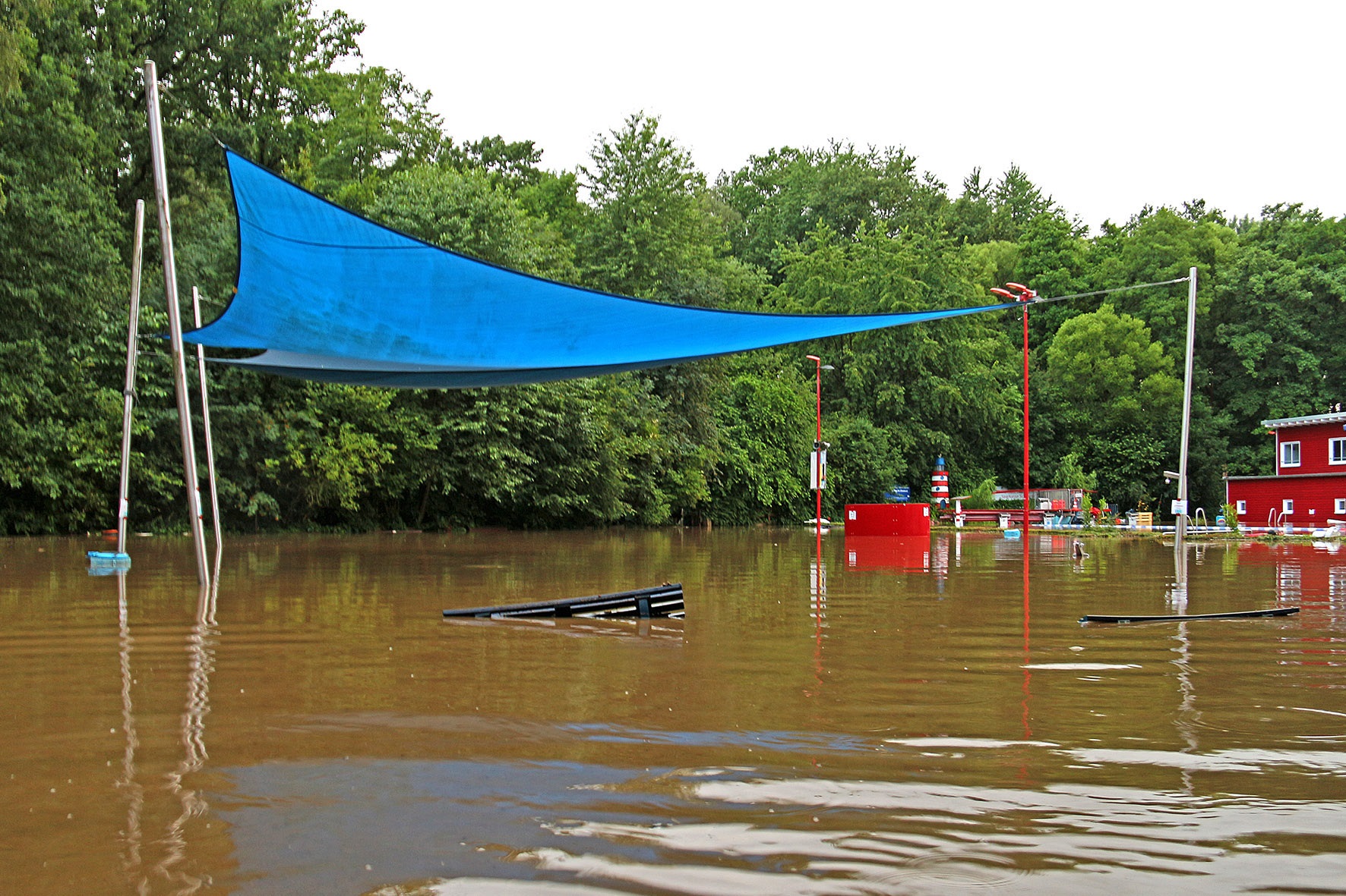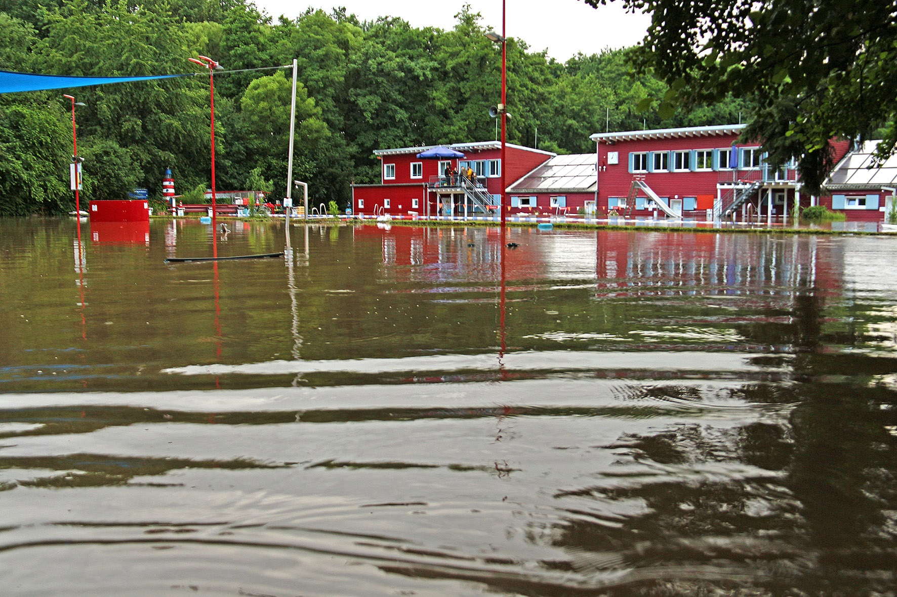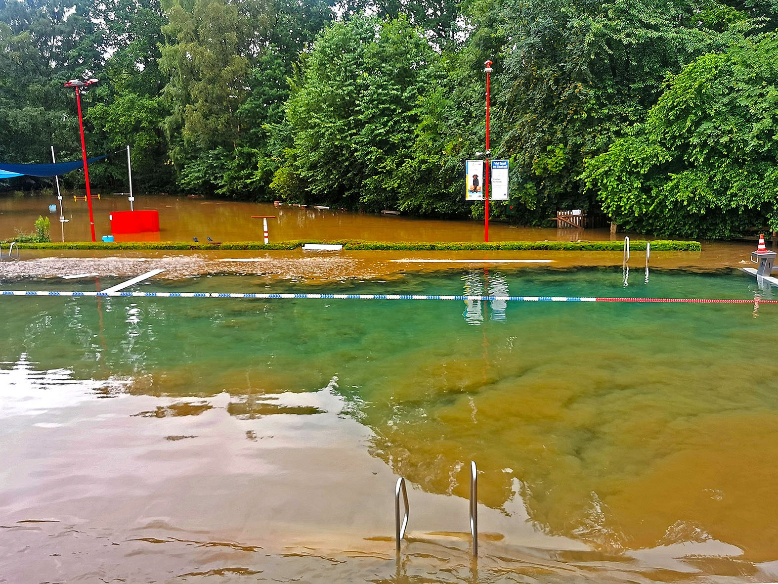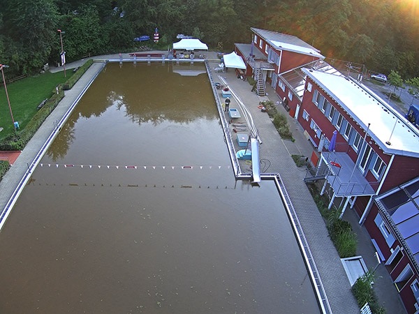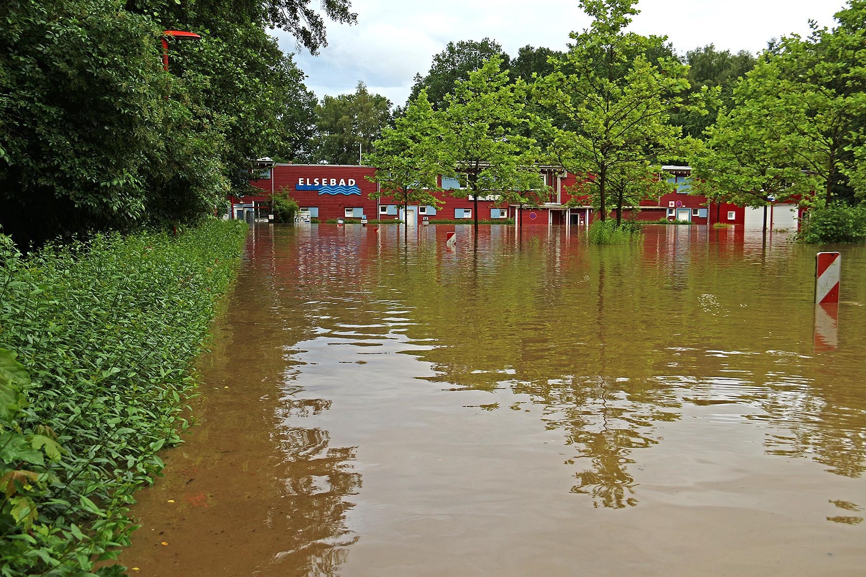 14. Juli: Für die Wassermassen des Elsebaches nach dem großen Regen am 14. Juli waren die Durchflüsse unter der Straße "Am Winkelstück" wieder viel zu klein: In kurzer Zeit stauten sich die braunen Fluten und begruben das gesamte Elsebad unter sich. Um 17 Uhr verabschiedete der Schwimmmeister wegen des Gewitters die letzten Badegäste, 2 Stunden später gab es kein Schwimmbecken mehr, und auch die Gebäude versanken im braunen Schlammwasser: Die Räume im Erdgeschoss standen fast 1 Meter tief unter Wasser, Technik- und Pumpenkeller gingen unter, allen baulichen Sicherungsmaßnahmen zum Trotz, die wir nach dem Hochwasser 2010 eingebaut haben.