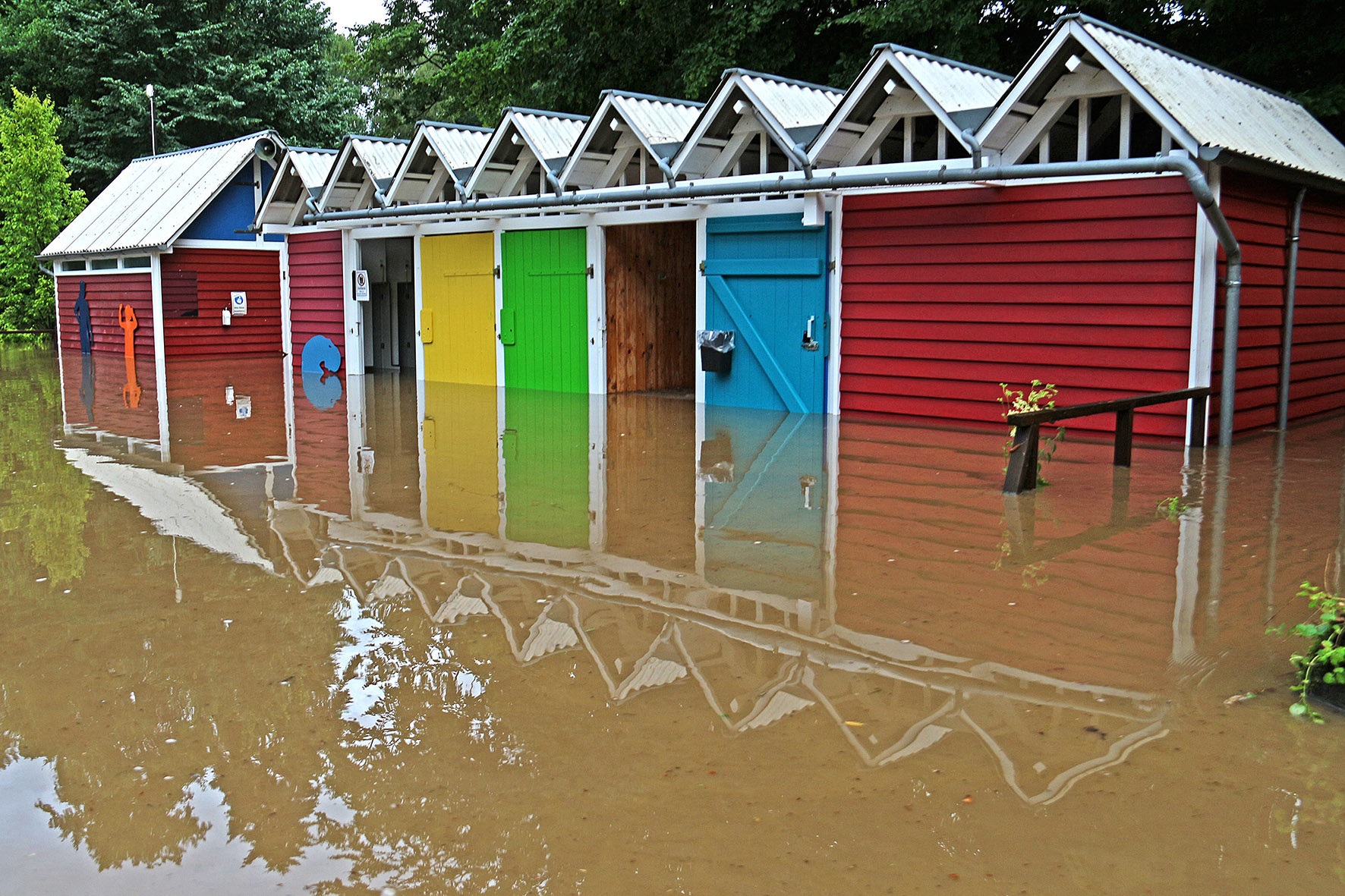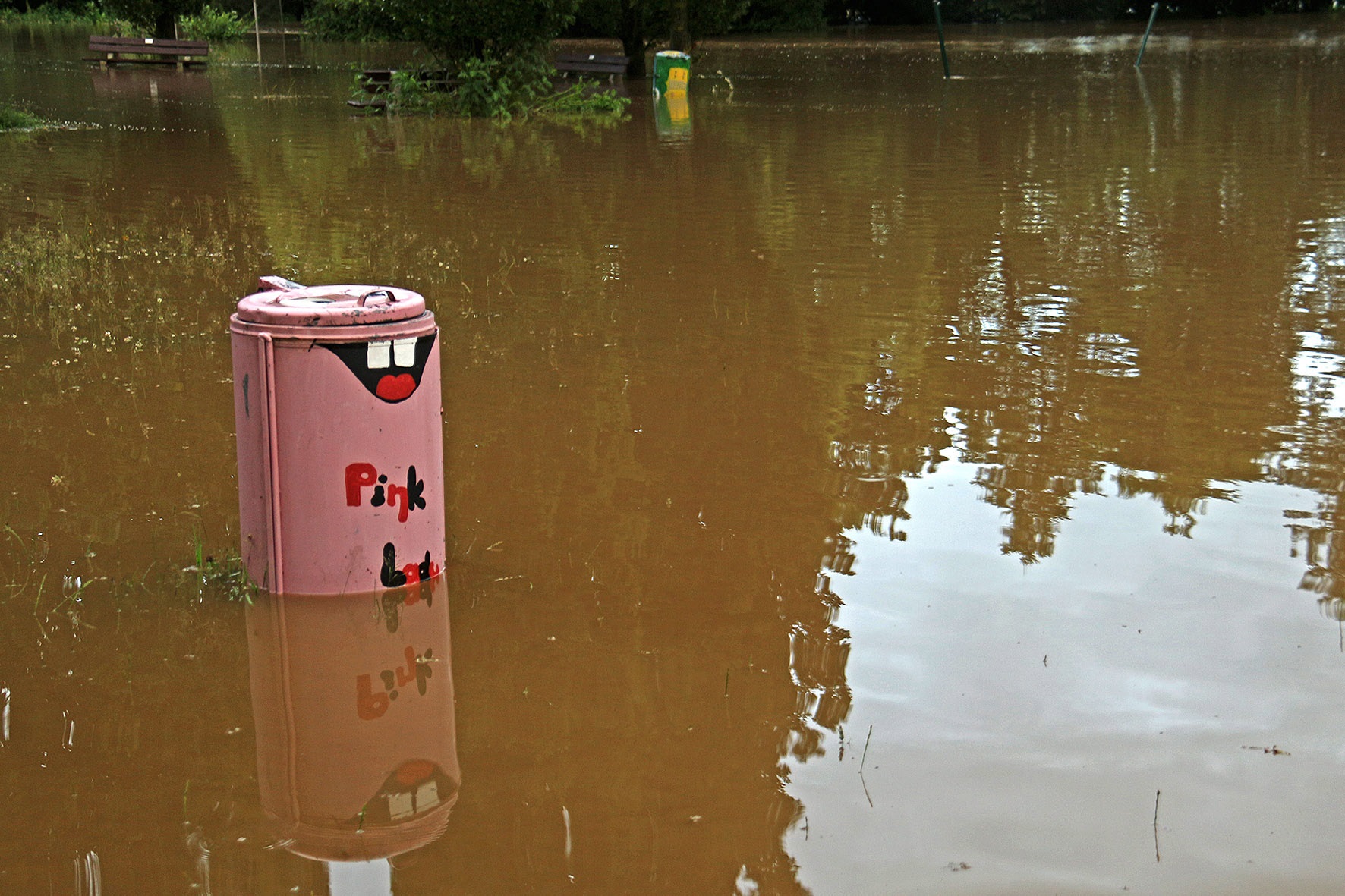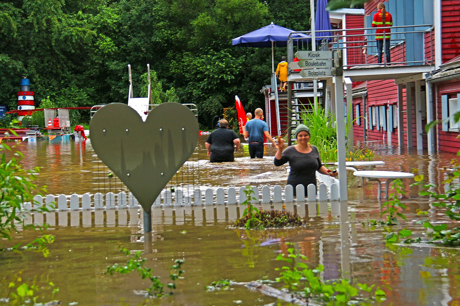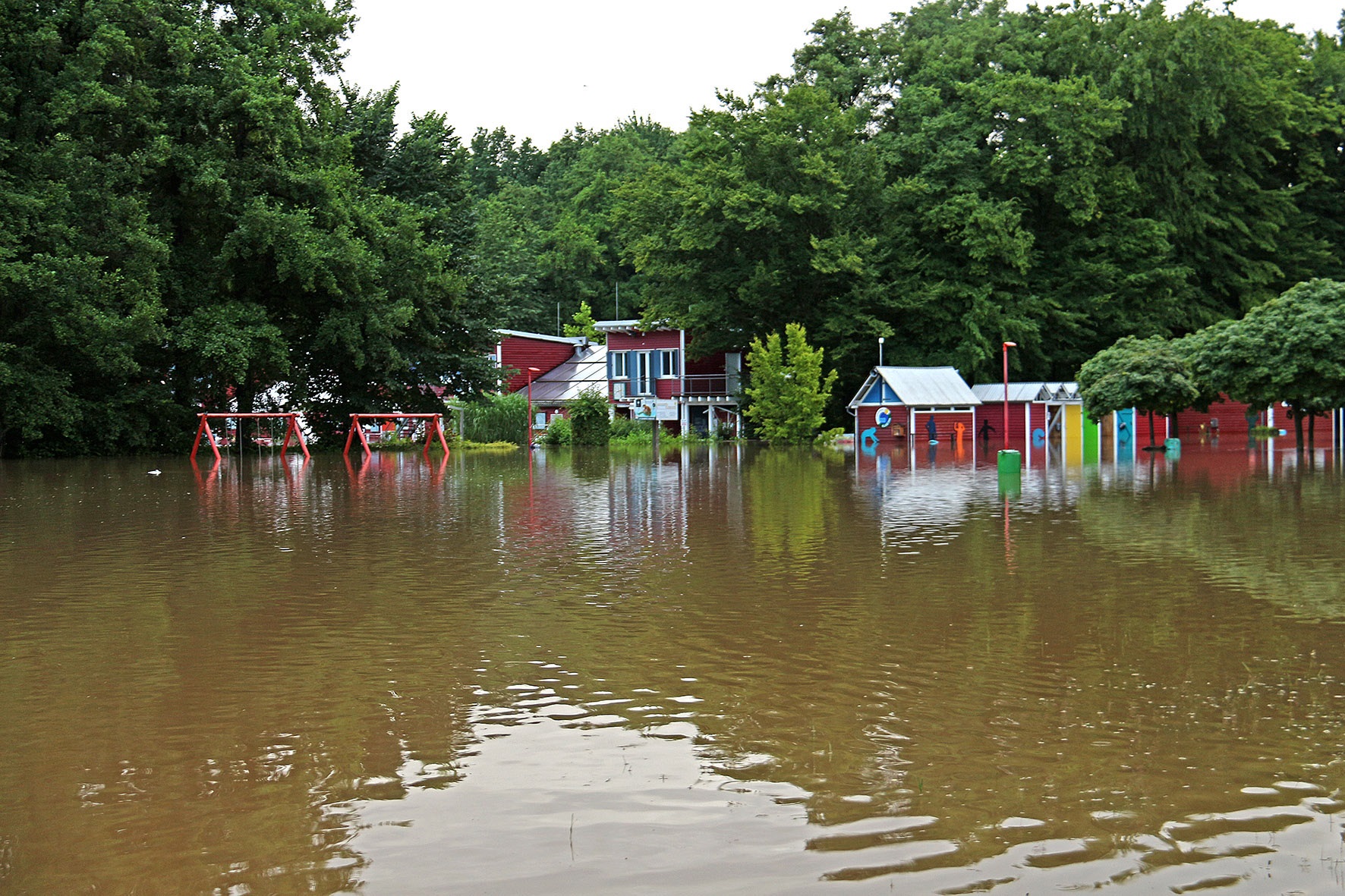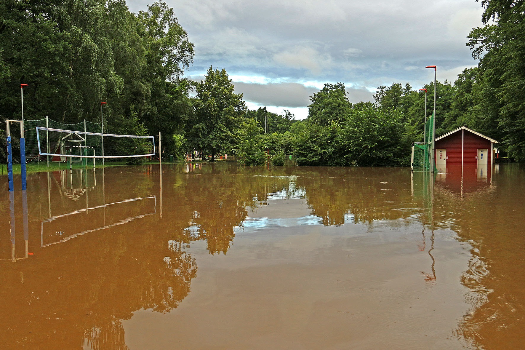 14. Juli: Für die Wassermassen des Elsebaches nach dem großen Regen am 14. Juli waren die Durchflüsse unter der Straße "Am Winkelstück" wieder viel zu klein: In kurzer Zeit stauten sich die braunen Fluten und begruben das gesamte Elsebad unter sich. Um 17 Uhr verabschiedete der Schwimmmeister wegen des Gewitters die letzten Badegäste, 2 Stunden später gab es kein Schwimmbecken mehr, und auch die Gebäude versanken im braunen Schlammwasser: Die Räume im Erdgeschoss standen fast 1 Meter tief unter Wasser, Technik- und Pumpenkeller gingen unter, allen baulichen Sicherungsmaßnahmen zum Trotz, die wir nach dem Hochwasser 2010 eingebaut haben.
