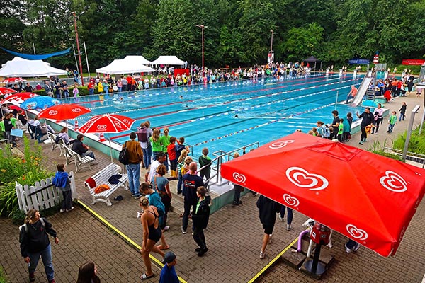 ‚Anbaden‘ – das heißt natürlich vor allem ins Wasser gehen: Dazu sind 4er Mannschaften eingeladen, ab 11.40 Uhr Kanus zu besteigen und damit ein Tauziehen auf dem Wasser zu machen – da bleibt kein Auge trocken. Den ganzen Tag kann man auch den künstlichen Wasserfall genießen, den das Technische Hilfswerk (THW) aufbaut. Und um 14.30 Uhr bietet Ramona einen Schnupperkurs in „Aqua Jogging“ an.