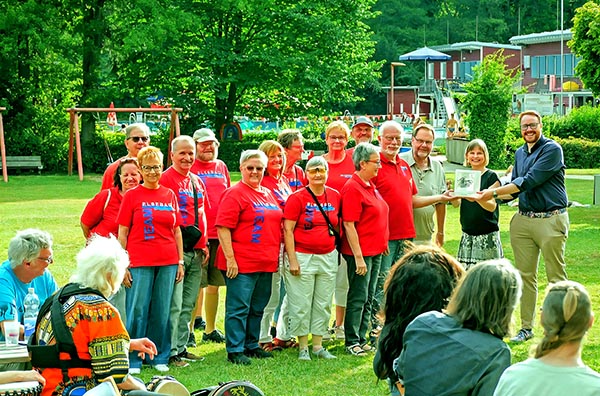 Maximilian Ziel erzählte uns in seiner Laudatio von der Entstehungsgeschichte des Bürgerbades in den 90er Jahren und davon, wie durch das bemerkenswerte bürgerschaftliche Engagement das Elsebad so einen bedeutenden Platz für die Bürger der Stadt Schwerte gewonnen hat. Seine Ausführungen wurden untermalt von dem rhythmischen Trommelspiel von „Yaya Nene“, alte Bekannte hier im Elsebad. Zur Übergabe des ‚Wanderpokals‘, einer zweifachen tätigen Hand in Glas standen dann 14 Mitglieder des eigentlich viel größeren Team Elsebad auf der Wiese und freuten sich über diese schöne Anerkennung. Beim anschließenden Imbiss, zu dem die Grünen eingeladen hatten, konnten sie dann noch viel aus ihrer Arbeit im Team für ihr gemeinsames großes Bürgerprojekt erzählen.