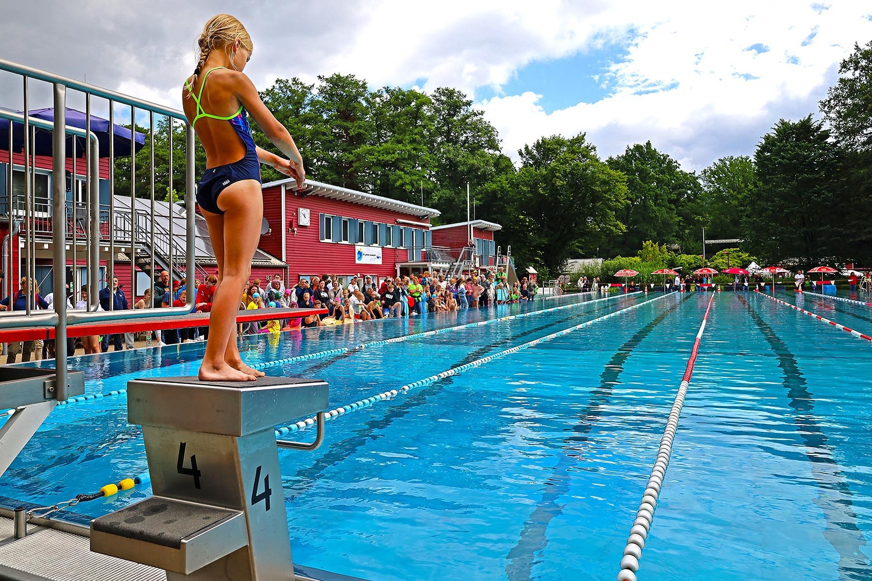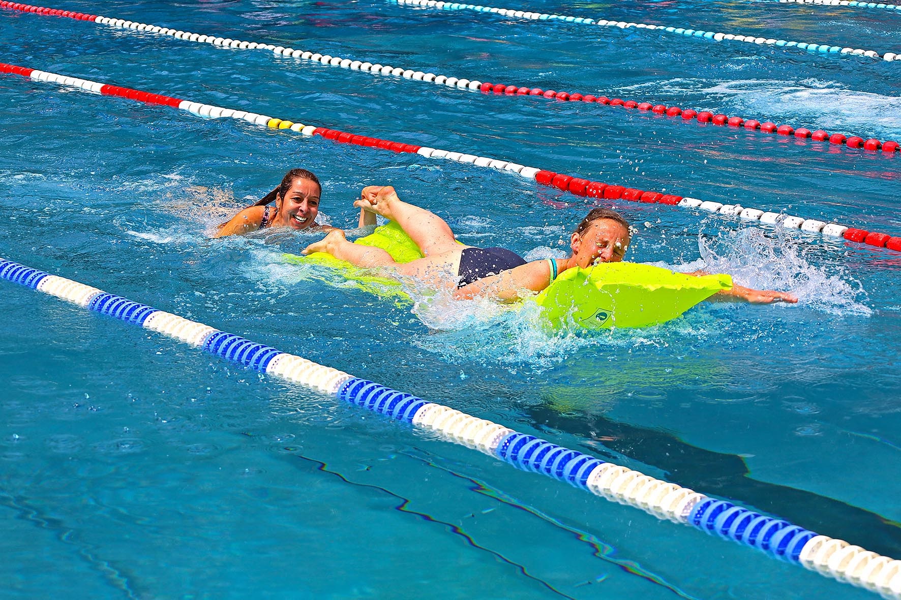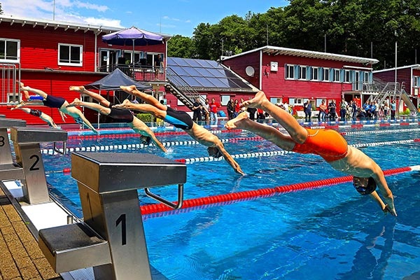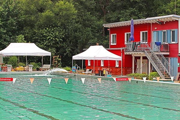 Man kann aber auch einfach ins klare Wasser springen und schwimmen und planschen, sich auf der Wiese in der Sonne räkeln oder sich an den vielen Spiel- und Sportangeboten betätigen – also bis 19.30 Uhr einen ersten Tag im Freibad genießen.