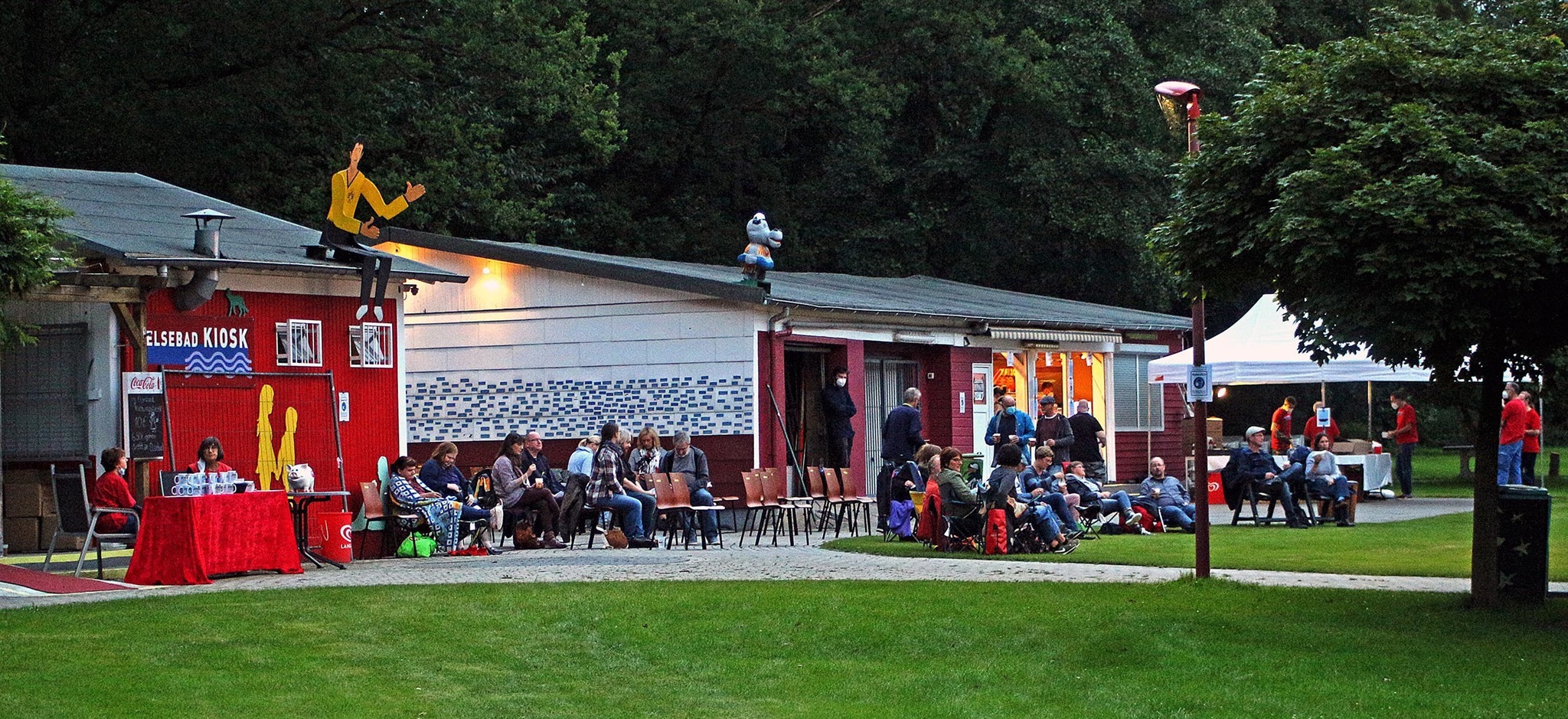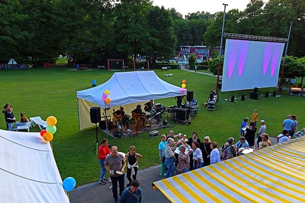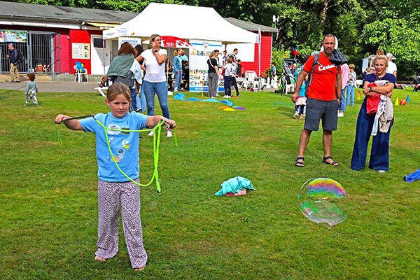 Die Feierlichkeiten beginnen um 10 Uhr mit dem Gottesdienst auf der Wiese: Pastorin Sigrid Reihs wird dem sommerlichen Freizeitvergnügen mit all seinen Begegnungen und Freuden den Segen geben und zur Kollekte für den Schwerter AK Asyl aufrufen. Dann wird der Weg zum Kiosk wieder zum ‚Boulevard Elsebad‘, auf dem die Schwerter BürgerInnen nach den langen Wintermonaten endlich wieder unter freiem Himmel sich begegnen können, hier ein Pläuschken halten, dort Informationen über die MitMachStadt, Solawi oder andere Initiativen bekommen, sich spannende Lektüre an Utes Bücherstand aussuchen, Feuerwehr- und THW-Gerätewagen bewundern und sich auf den Weg zum Kuchenbuffet des Fördervereins oder zur Eis- und Pommes-Bar von Rouvens Elsebad-Kiosk machen. Am Ende dieses Weges gelangt man auch zur Malschule „Kunst mal anders“, wo Kinder „Heckenkucker“ herstellen können, und zum Bouleturnier mit Rupert Filthaus.