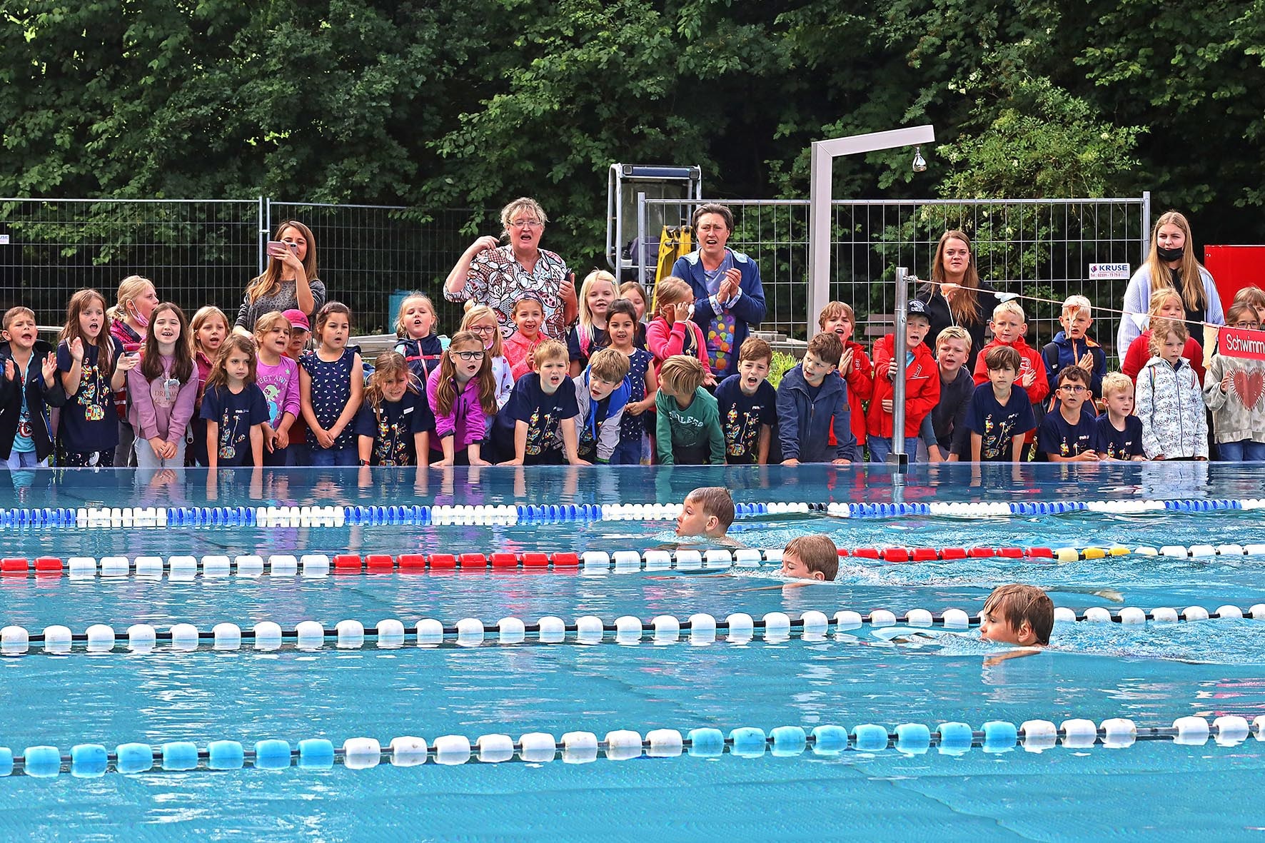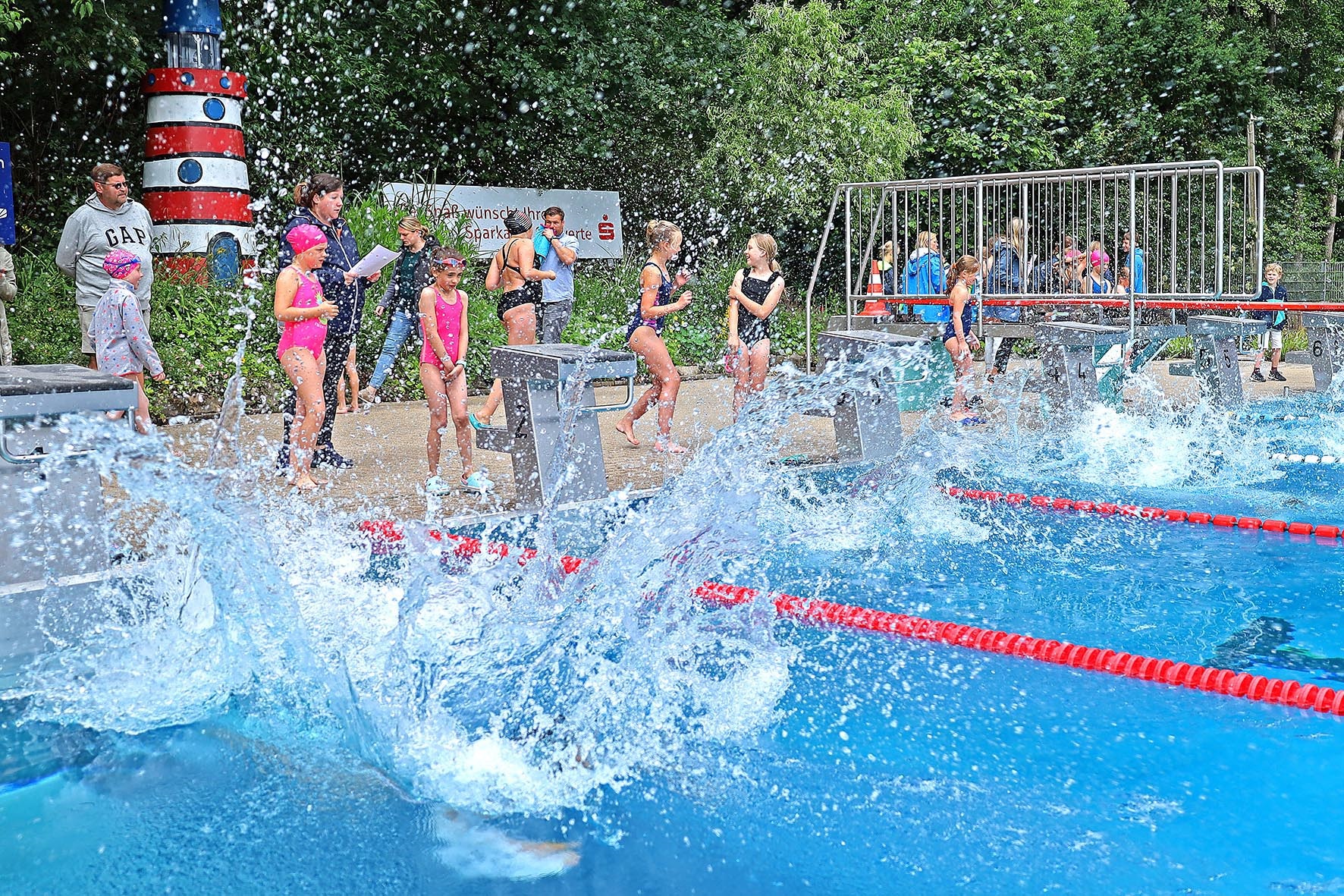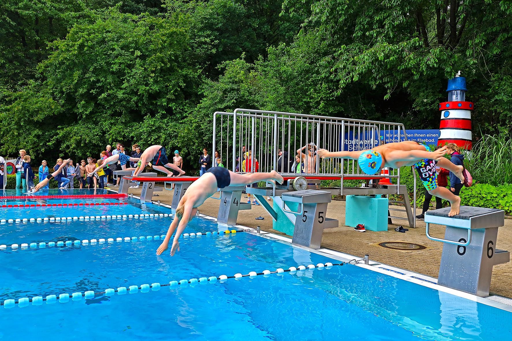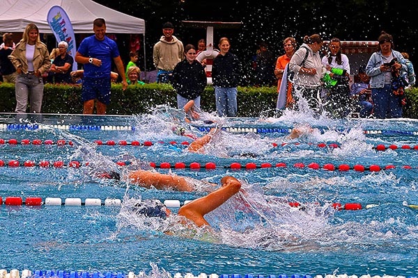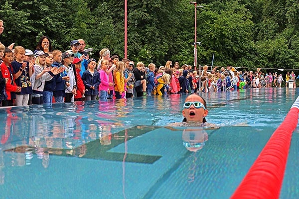 Während das Team Elsebad und das Wettkampfteam der SG Eintracht Ergste ab 8 Uhr das Gelände auf den Wettkampf vorbereiteten, fielen noch ein paar Regentropfen aus den dunklen Wolken, aber nachdem um 10 Uhr der erste Startpfiff ertönt war, blieb es trocken, zumindest außerhalb des Wassers. Im Becken dagegen schlugen die Wogen hoch, denn nach intensiven Vorbereitungen in ihren Schulen gaben die NachwuchsschwimmerInnen alles, um so schnell wie möglich die 50 Meter bis ins Ziel zu schaffen.