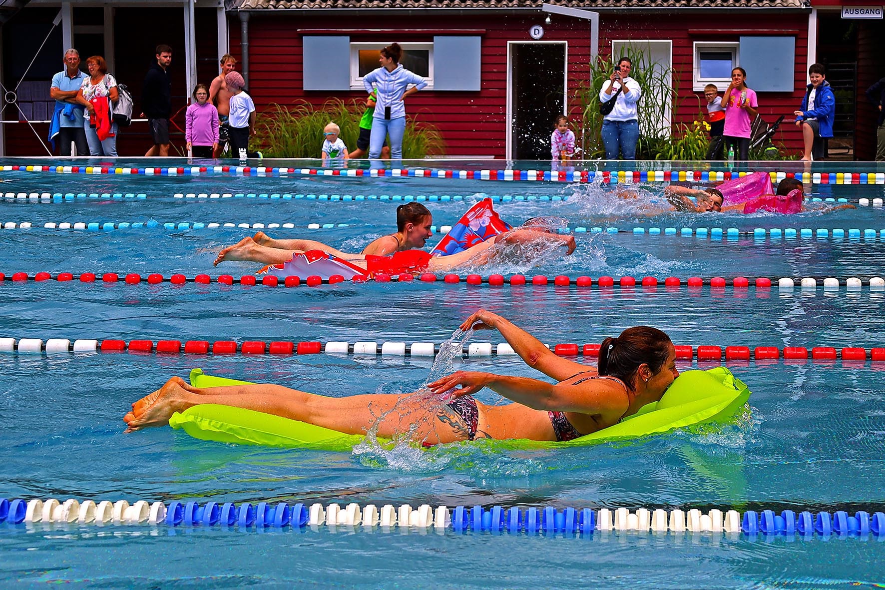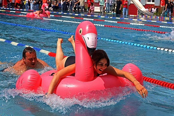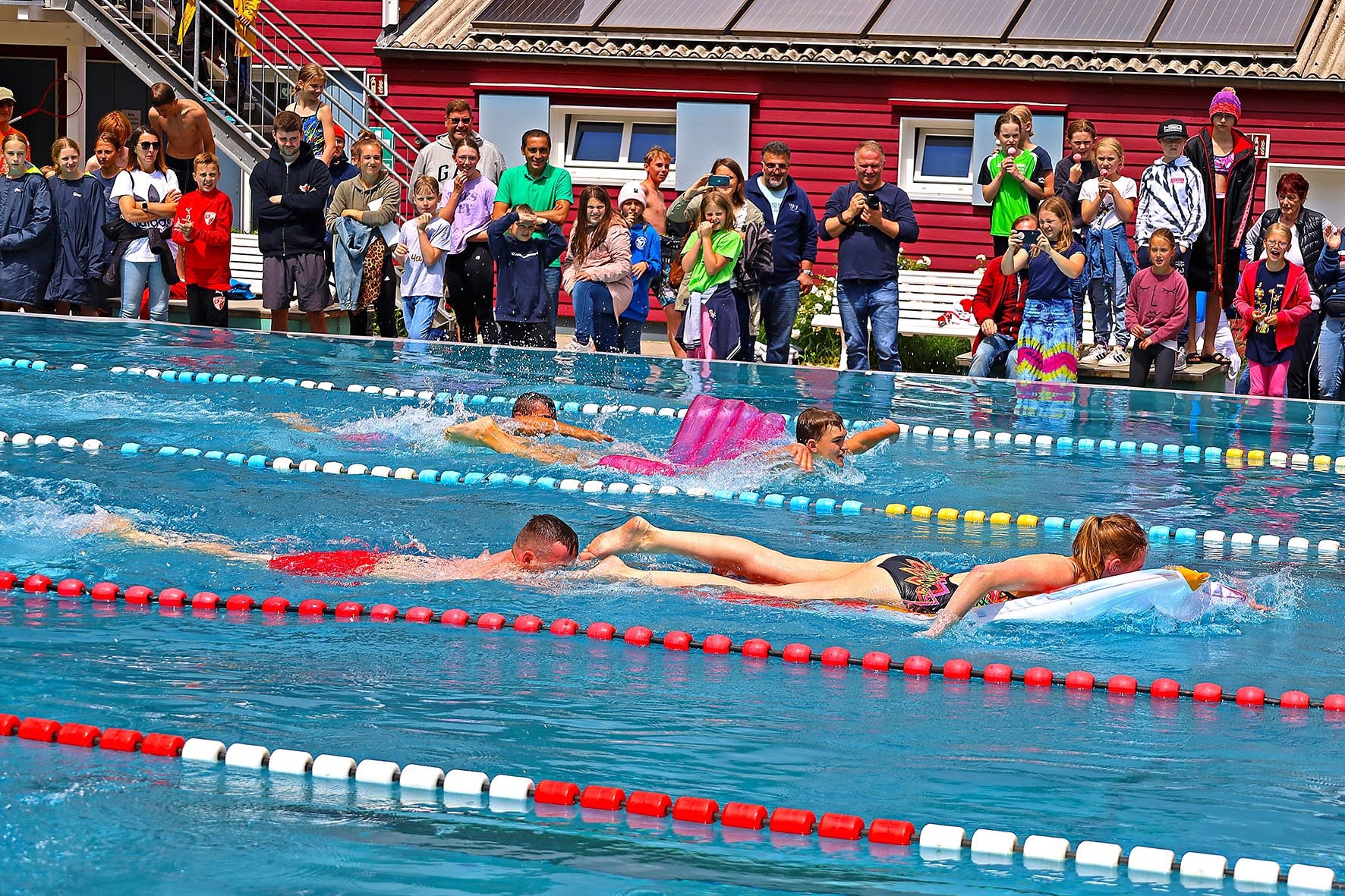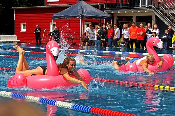 Schon lange vor dem geplanten Termin (7. Juli 2025) wird im Elsebad, in der SGE und in den Schwerter Schulen auf den Elsecup hingearbeitet. Und der Höhepunkt ist dann die Veranstaltung selbst. In den vergangenen Elsetaler Anzeigern haben wir viel zum Hintergrund und den Vorbereitungen geschrieben, deshalb seien heute vor allem die Ergebnisse genannt. Und eine Neuigkeit: Für die Luftmatratzenstaffel haben wir neue ‚Schwimmzeuge‘ besorgt: Zur Freude des Publikums traten die LehrerInnen diesmal auf pinken Flamingos gegeneinander an – und dabei hatte das FBG den Schnabel vorn.