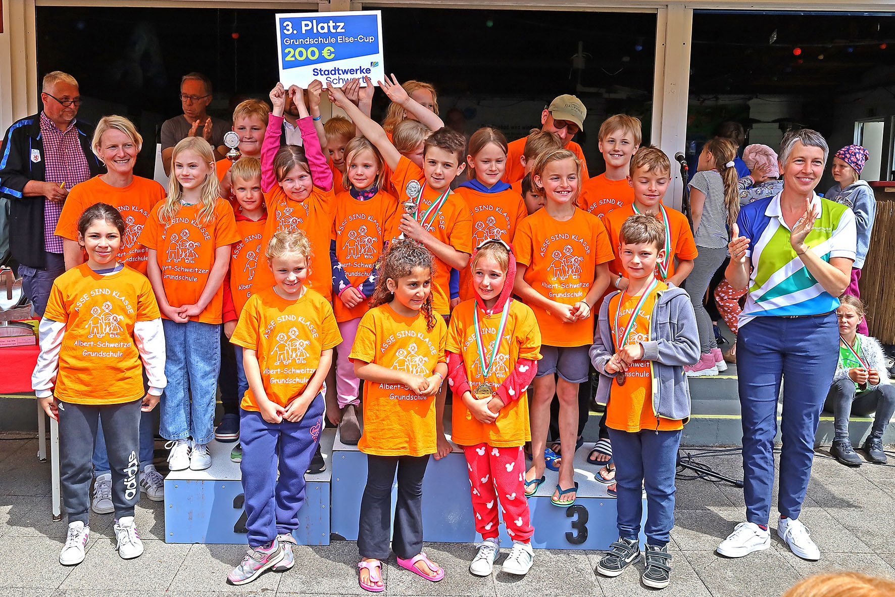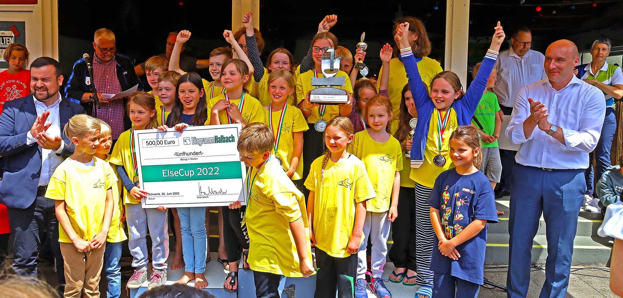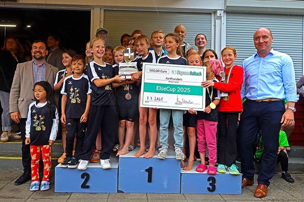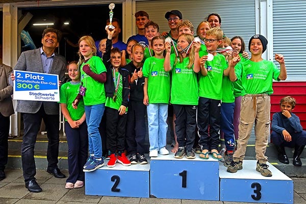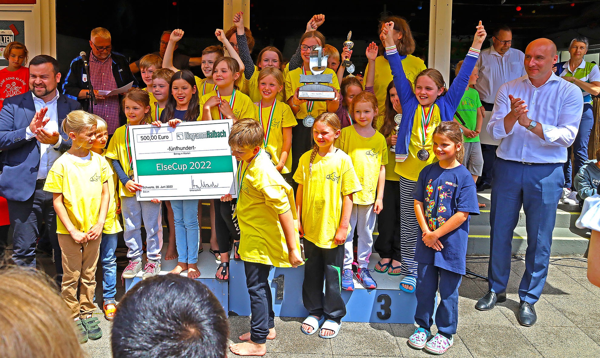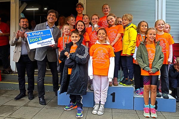 Danach gab es jede Menge Gold, Silber und Bronze und außerdem Pokale für die schnellsten Mädchen und Jungen, der Edelmetallregen trieb Bürgermeister Axourgos und Stadtsportchef Peter Schubert die Schweißperlen auf die Stirn, denn sie hatten die Aufgabe der vielfachen Verleihung übernommen. Und dann die mit Spannung erwartete Verkündung der erfolgreichsten Schulen, deren Platzierung nicht nur mit dem Wanderpokal des Elsebades, sondern auch mit den von der Sparkasse, Diagramm Halbach und den Stadtwerken gesponserten Preisen verbunden war: Der 3.-platzierten Albert-Schweitzer-Grundschule folgte mit besonderem Jubel die Grundschule Villigst, der es nach 20 Jahren endlich wieder gelungen war, aufs Treppchen des ElseCups zu steigen. Sieger wurde und den Wanderpokal mit nach Hause nehmen konnte wie beim letzten Mal die evangelische Grundschule Ergste. Bei den weiterführenden Schulen gelang dieser Erfolg wieder dem Friedrich-Bährens-Gymnasium, während das Ruhrtalgymnasium den Platz 2 und die Theodor-Fleitmann-Gesamtschule den Platz 3 belegten. An diese Schulen gingen auch die von den Sponsoren mit 200 €, 300 € und 500 € ausgesetzten Preise für die schulischen Sportetats.