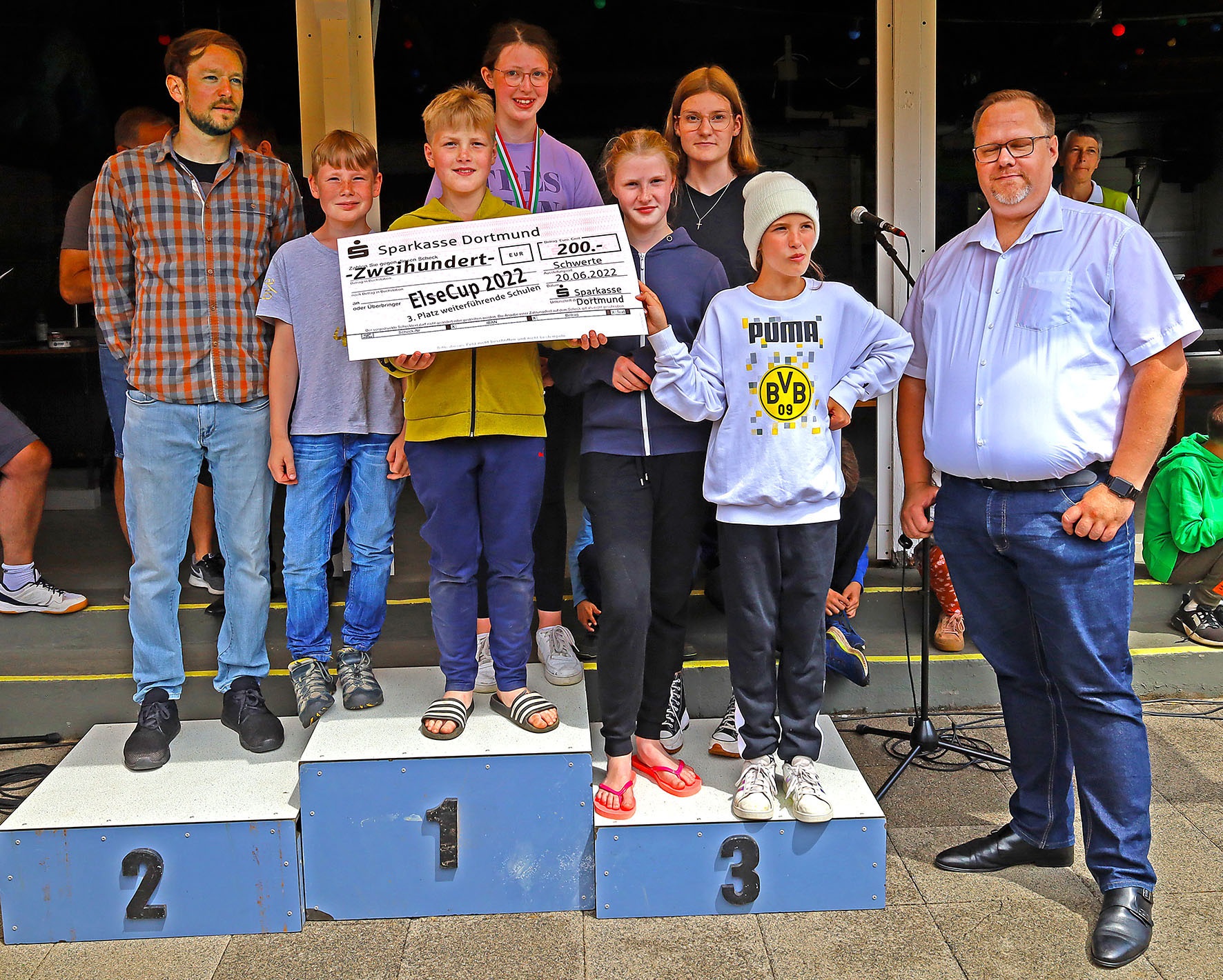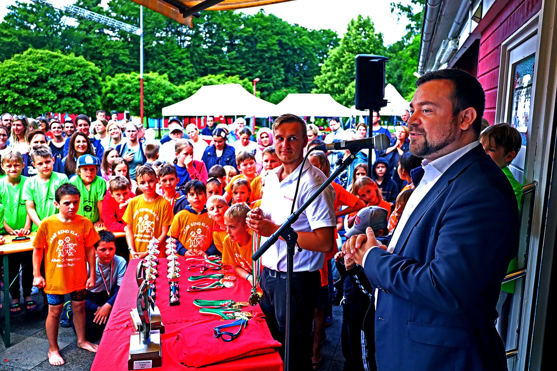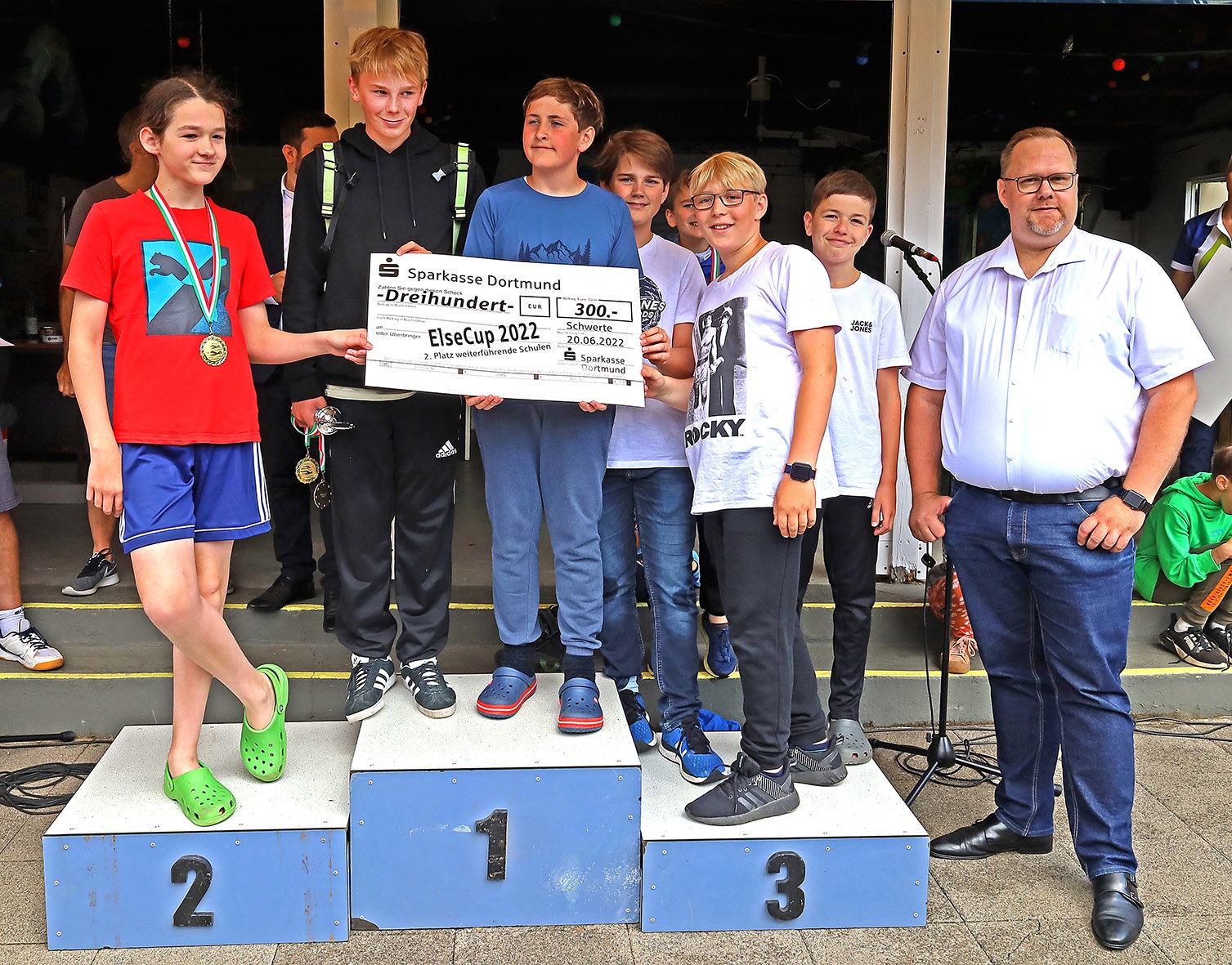 Danach gab es jede Menge Gold, Silber und Bronze und außerdem Pokale für die schnellsten Mädchen und Jungen, der Edelmetallregen trieb Bürgermeister Axourgos und Stadtsportchef Peter Schubert die Schweißperlen auf die Stirn, denn sie hatten die Aufgabe der vielfachen Verleihung übernommen. Und dann die mit Spannung erwartete Verkündung der erfolgreichsten Schulen, deren Platzierung nicht nur mit dem Wanderpokal des Elsebades, sondern auch mit den von der Sparkasse, Diagramm Halbach und den Stadtwerken gesponserten Preisen verbunden war: Der 3.-platzierten Albert-Schweitzer-Grundschule folgte mit besonderem Jubel die Grundschule Villigst, der es nach 20 Jahren endlich wieder gelungen war, aufs Treppchen des ElseCups zu steigen. Sieger wurde und den Wanderpokal mit nach Hause nehmen konnte wie beim letzten Mal die evangelische Grundschule Ergste. Bei den weiterführenden Schulen gelang dieser Erfolg wieder dem Friedrich-Bährens-Gymnasium, während das Ruhrtalgymnasium den Platz 2 und die Theodor-Fleitmann-Gesamtschule den Platz 3 belegten. An diese Schulen gingen auch die von den Sponsoren mit 200 €, 300 € und 500 € ausgesetzten Preise für die schulischen Sportetats.