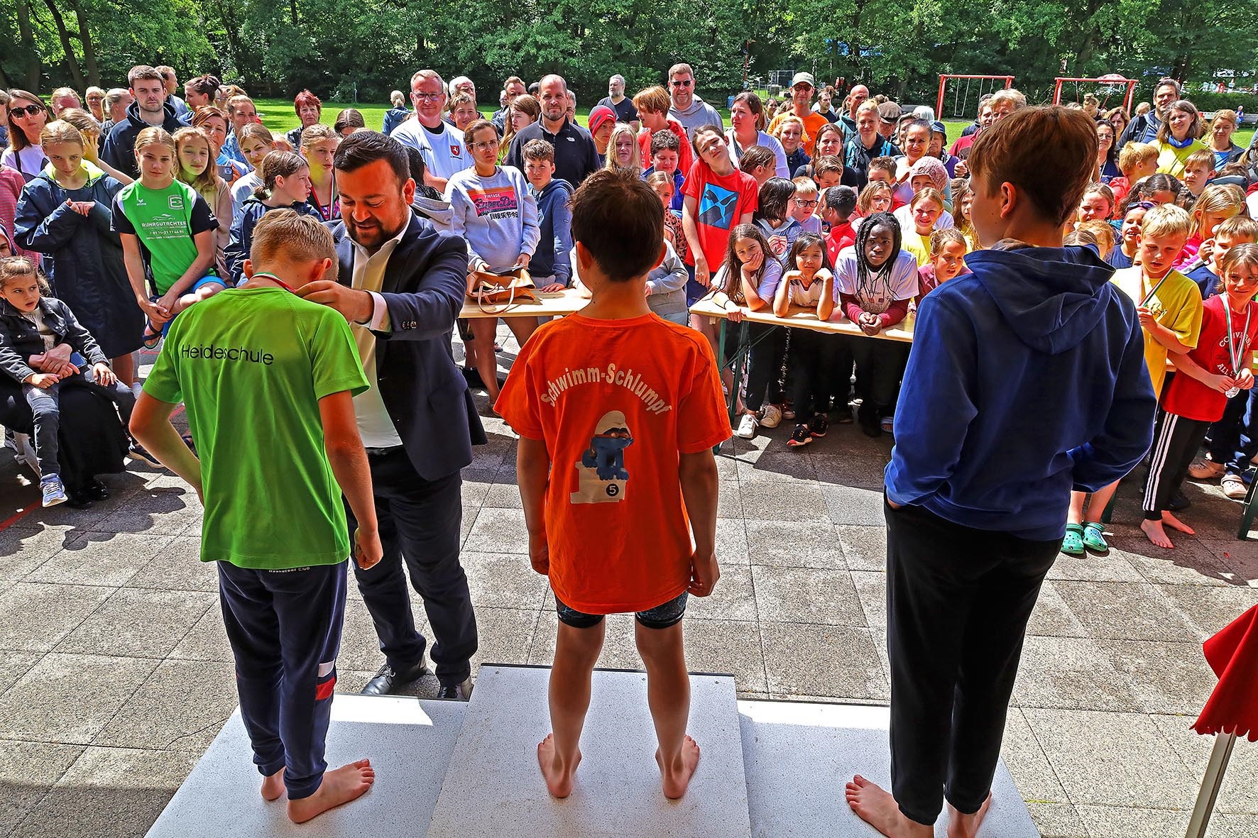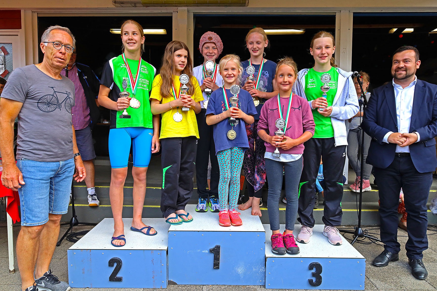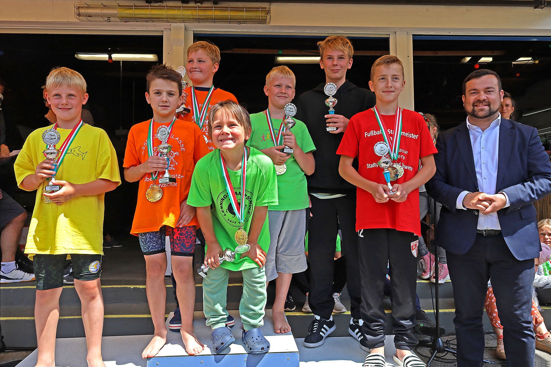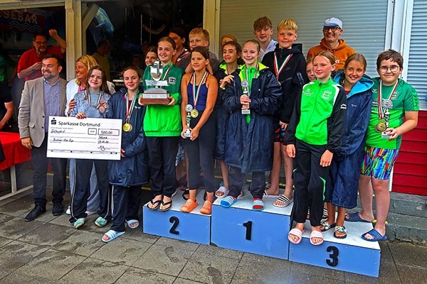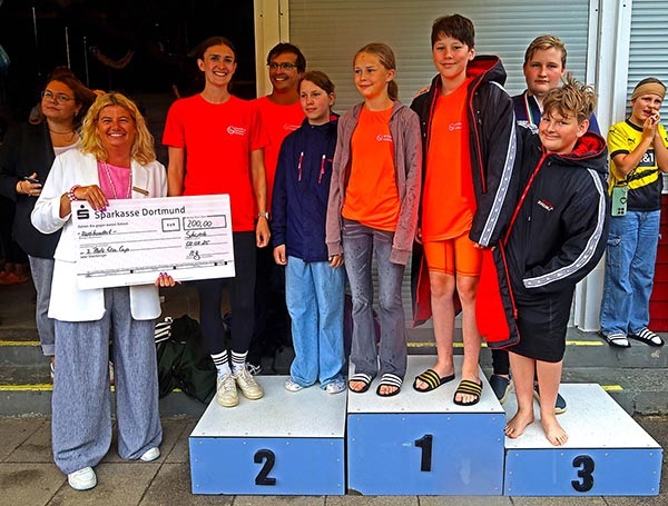 Ihre Medaillen und Pokale bekamen die Bestplatzierten aus den Händen von Bürgermeister Axourgos, den Sponsoren von Sparkasse Dortmund, Diagramm Halbach und den Stadtwerken Schwerte, von den international erfolgreichen Rettungsschwimmern Michael Maik und Anna Kathol und von Josefine Ludwig vom Stadtsportverband.