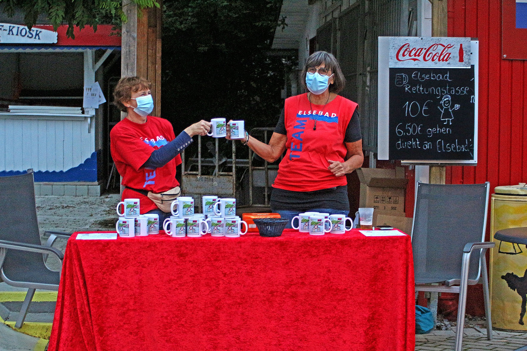 Schließlich kommt auch Thomas Gössling, Pastor der evangelischen Kirchengemeinde Ergste vorbei, berichtet von einer Kollekte zugunsten des Elsebades am letzten Sonntag und sagt seine Unterstützung beim Abbadefest zu, das - natürlich in anderer Form als sonst - am 5. September stattfinden soll, wenn Corona-Maßnahmen das zulassen. Auch die Becher-Aktion ("Rettungstasse Hochwasser 2021") in der Gestaltung von Karin Weichmann, gedruckt zum Selbstkostenpreis bei Engin Izgi (Emco-Werbetechnik) kommt richtig in Fahrt.