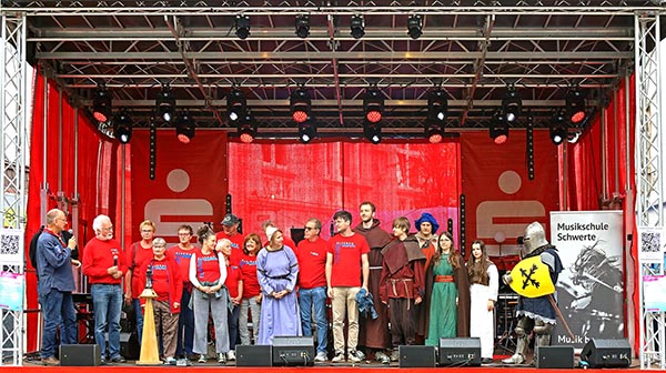 Die Pannekaukenfrau ist ein Pokal zur Anerkennung ehrenamtlichen Engagements für die Schwerter Bürger. Verliehen wird sie für jeweils ein Jahr vom Hanseverein e.V., der seit 2006 alljährlich mit vielen ehrenamtlichen Mitarbeitenden das größte Schwerter Stadtfest, das Pannekaukenfest, organisiert. Auf der großen Bühne am Postplatz hat uns am 14. September Thomas Buhl, der Vorsitzende des Hansevereins, die ziemlich schwere Bronzeskulptur übergeben. Zusammen mit Jutta Kriesten, Oberschichtmeisterin, und dem Wanderpokal haben wir, das ungefähr 20 Mann starke Team, eine kleine Prozession durch die Hüsingstraße bis zur Pannekaukenfrau auf dem Cava-Platz gemacht. Da hat uns Jutta die Geschichte dieser Schwerter Symbolfigur erzählt: