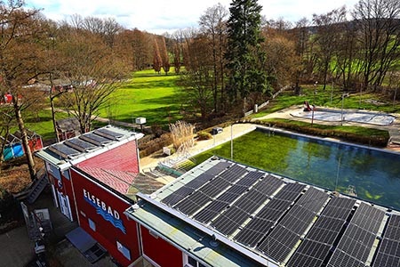 Die Investition hilft der gemeinnützigen Betriebs-GmbH natürlich auch dabei, die zuletzt ausufernden Energiekosten zu verringern. Zusammen mit der bereits vor über 10 Jahren installierten Thermo-Solaranlage wird das Elsebad nun etwa ein Drittel der benötigten Energie selbst produzieren können. Die neu errichtete Anlage spart nach Vorausberechnungen der ausführenden Firma „Tappeser“ mit ihren 77 Modulen auf ca. 140 m² ab sofort fast 13.000 kg CO²-Emissionen pro Jahr ein. Die so gewonnene elektrische Energie wird vor allem für den Betrieb der Pumpen während der Saison benötigt.
